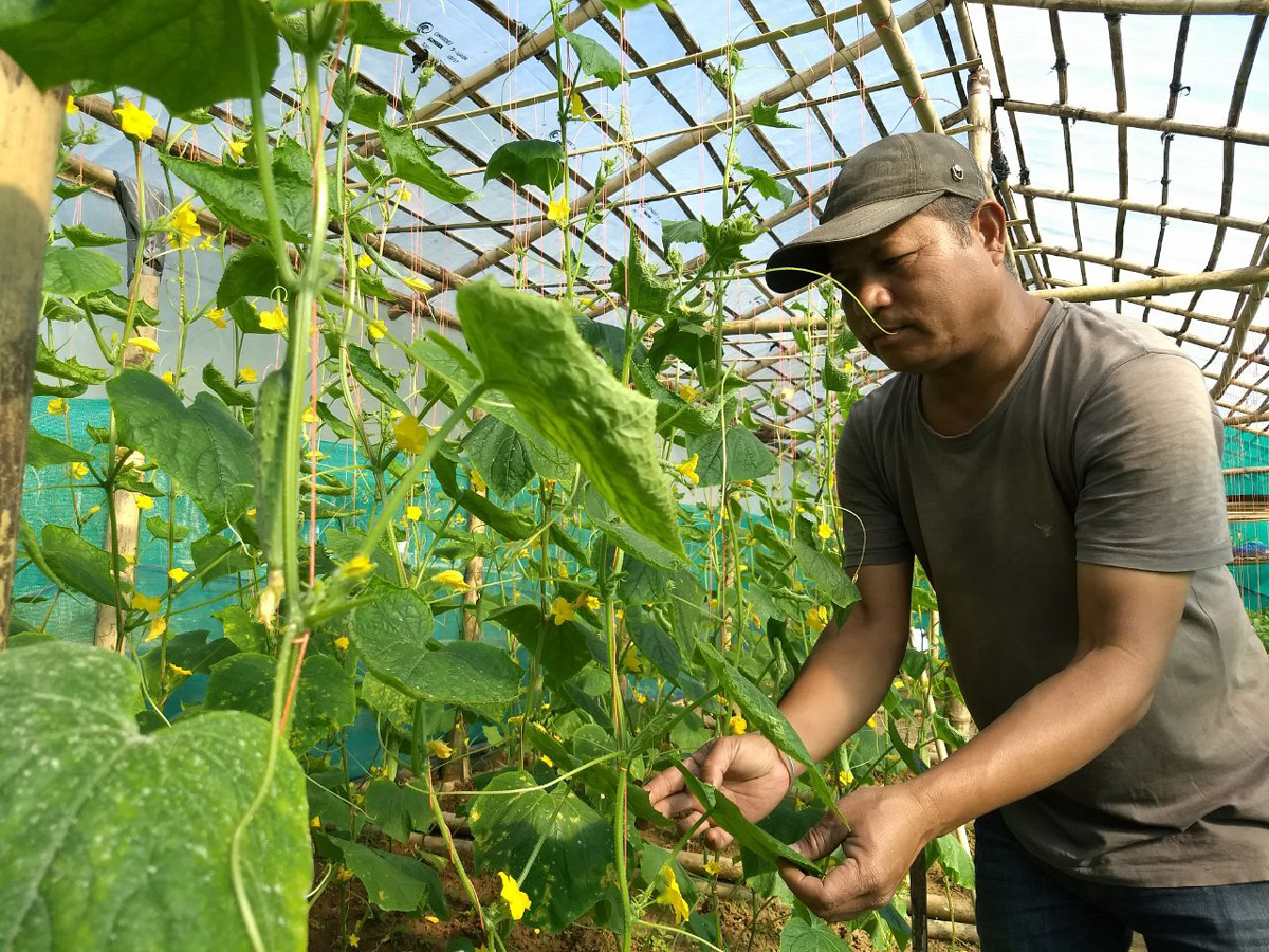 বঙাইগাঁৱৰ পৰা কিশোৰ দাস, ১ জানুৱাৰী: জৈৱিক খেতিৰ দ্বাৰা স্বাবলম্বী হৈছে অভয়াপুৰীৰ ৰাজীৱ সিংহ নামৰ এজন নিবনুৱা যুৱক। যি সময়ত ৰাজ্যত মুল্যবৃদ্ধিয়ে ৰাজ্যবাসীক জুৰুলা কৰিছে আৰু মূল্যবৃদ্ধি ৰোধ কৰিব নোৱাৰা চৰকাৰখনক দোষাৰোপ কৰিবলৈ লৈছে ৰাইজে, তেনে সময়তে ৰাজ্যৰ একাংশ যুৱকে নিজ চেষ্টাৰে স্বাৱলম্বী হোৱাৰ লগতে ৰাজ্যবাসীক যোগান ধৰিছে জৈৱিক প্ৰক্ৰিয়াৰে উৎপাদিত সামগ্ৰী। তেনে এজন যুৱক হৈছে অভয়াপুৰীৰ ৰাজীৱ সিংহ। আনুষ্ঠানিক শিক্ষা সমাপ্ত কৰি চৰকাৰী চাকৰিৰ পিছত সময় নষ্ট নকৰি কৃষিকে জীৱন সাৰথি কৰি লৈছে ৰাজীৱ সিংহই। প্ৰায় ১৭ বছৰৰ পূৰ্বে পছিশ বিঘা মাটিত চাহ খেতিৰ লগতে কমলা, সাচি আৰু নেমুৰ খেতি আৰম্ভ কৰিছিল ৰাজীৱে। পৰবৰ্তী সময়ত ষ্ট্ৰবেৰী খেতিত আৰম্ভ কৰি নিজকে আৰ্থিক ভাৱে স্বাৱলম্বী কৰি তোলে ৰাজীৱে। ৰাজ্যত ফুলৰ চাহিদাৰ প্ৰতি লক্ষ্য ৰাখি ৰাজীৱে এডৰা মাটিত ৰজনীগন্ধা ফুলৰ খেতি আৰম্ভ কৰে। পাচলিৰ অভাৱনীয় মুল্যবৃদ্ধিৰ পৰা ৰাইজক সকাহ দিয়াৰ উদ্দেশ্য পাচলি খেতি কৰিবলৈ পদক্ষেপ গ্ৰহণ কৰে। চাহিদা আৰু যোগানৰ মাজৰ সামঞ্জস্যহীনতাৰ বাবেই পাচলিৰ মুল্য বৃদ্ধি পোৱা কথাটোৰ প্ৰতি লক্ষ্য ৰাখি ৰাজীৱে বিকল্পৰ পথ বিচাৰি পাচলিৰ খেতি আৰম্ভ কৰে। ৰাজীৱে পৰিচালনা কৰি গম পালে যে জন বিস্ফোৰণৰ সময়ত পৰম্পৰাগত কৃষিৰ জৰিয়তে পাচলিৰ বৰ্ধিত চাহিদা পুৰণ কৰিবলৈ সম্ভব নহব। তাৰোপৰি বতৰীয় কৃষিৰ দ্বাৰা চাহিদা পূৰণ কৰিব পাৰিলেও ব্যক্তিগত ভাবে বহু লোকচানৰ সন্মুখীন হ’ব লগিয়া হয়। ইয়াৰ ফলত আধুনিক বিজ্ঞান সন্মত পদ্ধতি ব্যৱহাৰ কৰি আৱতৰীয়া পাচলিৰ খেতি কৰাৰ ওপৰত গুৰুত্বৰ আৰোপ কৰে ৰাজীৱে। এই ক্ষেত্ৰত ৰাজীৱ সিংহই বঙাইগাঁও জিলাৰ কৃষি বিজ্ঞান বিভাগৰ মুখ্য বিজ্ঞানী ডঃ চিন্ময় শৰ্মাৰ কাৰিকৰী সহায়ত নিজ বাগানৰ ভিতৰভিত ৩৫ হাজাৰ টকাৰ বিনিময়ত পৰীক্ষামূলক ভাৱে আৰম্ভ কৰিছিল সেউজ গৃহ। ১৭ মিটাৰ বহল আৰু ৬ মিটাৰ দীঘল এই গৃহটোৱে বৰ্তমান সময়ত তিঁয়হ, বিলাহীৰ খেতি আৰম্ভ কৰিছে। এনে ধৰণৰ পদক্ষেপ ৰাজ্যৰ অন্য কৃষকসকলে গ্ৰহণ কৰিলে মূল্যবৃদ্ধি হ্ৰাস পোৱাৰ লগতে কৃষকসকল অতি কম খৰছৰ বিনিময়ত অধিক লাভবান হব পাৰি।