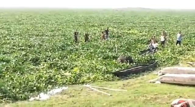 ঘন্টা ঘন্টা ধৰি আৱদ্ধ হৈ পৰা হাতীটো এটা সময়ত কিছু পাৰলৈ আহিছিল যদিও এখন নাওত উঠি জনসমাগম দেখি পুনৰ উভতি গৈছিল মেটেকাৰ মাজলৈ ।