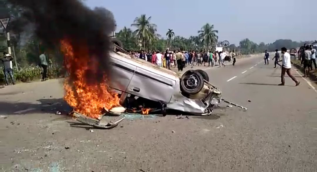 জাগীৰোড, ১৮ ডিচেম্বৰঃ সোমবাৰে পুৱা প্ৰায় ১০ বজাত গুৱাহাটী মহানগৰীৰ সমীপৱৰ্তী জাগীৰোডৰ কাহিকুছিত এক তীব্ৰ বেগী গাড়ীৰ খুন্দাত এজন স্থানীয় যুৱক থিতাতে নিহত হয়। পুৱা প্ৰায় ১০ মান বজাত গুৱাহাটীৰ পৰা জাগীৰোড অভিমুখে গৈ থকা এখন এল্ট গাড়ীৰ খুন্দাত থিতাতে নিহত হয় কাহিকুছিৰ স্থানীয় যুৱক আমিৰ হুছেইন। দুর্ঘটনা সংঘটিত হোৱাৰ পিছত একাংশ উত্তেজিত ৰাইজে গাড়ীখন লণ্ড ভণ্ড কৰি গাড়ীখনত অগ্নি সংযোগ কৰে। উল্লেখ্য যে দুর্ঘটনা সংঘটিত হোৱাৰ কিছু সময় পিছতে ক্ষেত্ৰী আৰক্ষী আহি দুর্ঘটনাস্থলীত উপস্থিত হয় যদিও উত্তেজিত ৰাইজে আৰক্ষীৰ সন্মুখতে গাড়ীখন লণ্ড ভণ্ড কৰি অগ্নি সংযোগ কৰে। আৰক্ষীৰ সন্মুখতে এইদৰে গাড়ী এখন লণ্ড ভণ্ড কৰি অগ্নি সংযোগ কৰাৰ ঘটনা অসম আৰক্ষীৰ বাবে লাজাজনক বুলি অভিহিত কৰিছে একাংশই আৰু এয়া চৰম বিফলতা এক প্ৰমাণ বুলি মত পোষণ কৰে স্থানীয় কিছুমান লোকে।