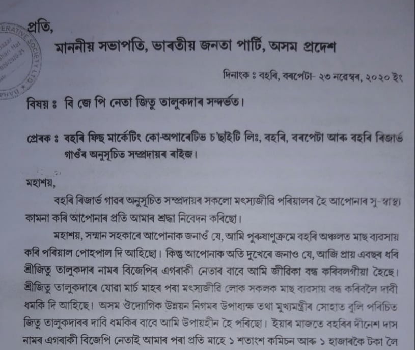 বিজেপি নেতা জিতু তালুকদাৰৰ অত্যাচাৰৰ বিৰুদ্ধে অবশেষত নিৰ্যাতিত মৎস্যজীৱি লোকসকলে বিজেপিৰ ৰাজ্যিক সভাপতি ৰঞ্জিত কুমাৰ দাসক লিখিত অভিযোগ দাখিল কৰাৰ লগতে ৰাজ্যৰ মুখ্যমন্ত্ৰী সৰ্বানন্দ সোণোৱাল, ৰাজ্য চৰকাৰৰ বিত্তমন্ত্ৰী হিমন্ত বিশ্ব শৰ্মা, বিজেপিৰ সংখ্যালঘু মৰ্চাৰ ৰাজ্যিক সভাপতি মুক্তাৰ হুছেইন খানৰ লগতে বৰপেটা জিলা বিজেপি আৰু চেঙা মণ্ডল বিজেপিকো উক্ত অভিযোগৰ প্ৰতিলিপি প্ৰেৰণ কৰিছে৷ বিজেপি নেতা জিতু তালুকদাৰৰ বিৰুদ্ধে মৎস্যজীৱি লোকসকলে উত্থাপন কৰা অভিযোগ অনুসৰি অসম ঔদ্যোগিক উন্নয়ন নিগমৰ উপাধ্যক্ষ জিতু তালুকদাৰে বহৰি বজাৰৰ মাছ ব্যৱসায়ীৰ ওপৰত প্ৰায় এবছৰ ধৰি চলাই আহিছে অত্যাচাৰ ৷ মূলত মাছ বজাৰৰ কমিছনৰ ধনক লৈ জিতু তালুকদাৰৰ সৈতে এইসকল দুখীয়া মাছমৰীয়াৰ সংঘাত আৰম্ভ হোৱা বুলি অভিযোগ উত্থাপন কৰিছে৷ নিজকে প্ৰভাৱশালী নেতা বুলি দাবী কৰা জিতু তালুকদাৰক লাগে মাছ ব্যৱসায়ৰ কমিছন৷ কমিছন আদায় নিদিলেই আৰক্ষী, প্ৰশাসনক ব্যৱহাৰ কৰি মৎস্য ব্যৱসায়ী সকলৰ ওপৰত হাৰাশাস্তি চলোৱাৰ লগতে দেহৰক্ষী লগত লৈ গৈ জপিয়াই পৰে মাছ ব্যৱসায়ীৰ ওপৰত৷ বয়োজ্যেষ্ঠ মাছ ব্যৱসায়ী একোজনকো গতিয়াই, ঢকিয়াই, জোতাৰে গছকি নিৰ্যাতন চলাই আহিছে জিতু তালুকদাৰে৷ পূৰ্বতে জিতু তালুকদাৰৰ নিৰ্দেশমৰ্মে দীনেশ দাস নামৰ এজন বিজেপি নেতাই মাছ ব্যৱসায়ীৰ পৰা ১ শতাংশ কমিছন আৰু মাহেকত এহেজাৰ টকা আদায় কৰি আহিছিল কিন্তু মাছ ব্যৱসায়ীসকলে যোৱা অক্টোবৰ মাহৰ পৰা বিজেপি নেতাজনক কমিছনৰ টকা আদায় দিয়া বন্ধ কৰাৰ বাবেই ব্যক্তিগত নিৰাপত্তাৰক্ষী লগত লৈ গৈ ৰামপ্ৰসাদ মালো দাস নামৰ বয়োজ্যেষ্ঠ লোকজনক শাৰিৰীকভাৱে অপদস্থ কৰাৰ লগতে একাংশ অনুগত সাংবাদিকৰ জৰিয়তে মাছ ব্যৱসায়ী সকলৰ বিৰুদ্ধে নানা অপপ্ৰচাৰ চলাই আহিছে বুলিও অভিযোগ উত্থাপন কৰিছে জিতু তালুকদাৰৰ বিৰুদ্ধে৷ মৎস্য ব্যৱসায়ীসকলে জনোৱামতে, জিতু তালুকদাৰৰ নিৰ্দেশমৰ্মে বহৰি বজাৰৰ দীনেশ দাস নামৰ এগৰাকী বিজেপি নেতাই বহৰি বজাৰৰ মাছ ব্যৱসায়ৰ ১ শতাংশ কমিছন আৰু নগদ এক হাজাৰ টকা আদায় কৰি আহিছে কিন্তু মাছ ব্যৱসায়ীসকলে সম্প্ৰতি পৰিয়াল চলাব নোৱাৰা হোৱাত কমিছন আদায় দিয়া বন্ধ কৰাৰ ফলত আৰক্ষী প্ৰশাসনৰ বিভিন্ন বিষয়াৰ জৰিয়তে মাছ ব্যৱসায়ীসকলক ভীতিগ্ৰস্থ কৰি আহিছে আৰু বিগত কেবাদিন ধৰি তেওলোকে ভয় ভীতিৰ মাজত ব্যৱসায় চলাই থাকিবলগীয়া হৈছে৷