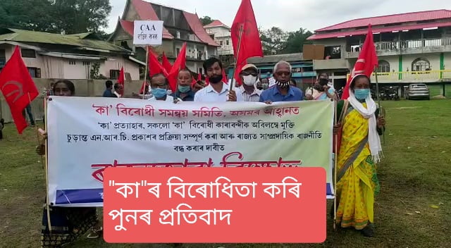 বিশ্বব্যাপী কৰ’ণা মহামাৰীৰ বাবে স্তব্ধ হৈ পৰা “কা” বিৰোধী আন্দোলন পুনৰ আৰম্ভ হৈছে। বুধবাৰে ৰাজ্যৰ বিভিন্ন প্ৰান্তত “কা”ৰ বিৰোধিতা কৰি “ক”‘ বিৰোধী সযন্বয় সমিতিয়ে প্ৰতিবাদী কাৰ্যসূচী ৰূপায়ন কৰে। মহানগৰীত গুৱাহাটী ক্লাৱত “ক”‘ বিৰোধী সযন্বয় সমিতিয়ে “কা”ৰ বিৰোধিতা কৰাৰ লগতে ৰাষ্ট্ৰীয় নাগৰিক পঞ্জীৰ চূড়ান্ত তালিকা প্ৰকাশ কৰাৰ প্ৰক্ৰিয়া সম্পূৰ্ণ কৰাৰ লগতে “কা”ৰ বিৰোধিতা কৰা কাৰাবন্ধী সকলক অতি শীঘ্ৰে মুক্তি দিয়া আৰু সাম্প্ৰদায়িক ৰাজনীতি বন্ধ কৰাৰ দাবীত উত্তাল প্ৰতিবাদ সাব্যস্ত কৰে। প্ৰৰিবাদকাৰী সকলে বিভিন্ন চৰকাৰ বিৰোধী শ্ল’গানেৰে গুৱাহাটী ক্লাব উত্তাল কৰি তোলে। ইফালে শিৱসাগৰ নগৰতো “কা” বিৰোধী সমন্বয় সমিতিয়ে প্ৰতিবাদী সমদল আৰু ধৰ্ণা কাৰ্যসূচী ৰূপায়ণ কৰে। একাধিক দল-সংগঠনৰ দ্বাৰা গঠিত “কা” বিৰোধী সমন্বয় সমিতিয়ে স্থানীয় তাই আহোম কৃষ্টি বিকাশ কেন্দ্ৰৰ খেলপথাৰৰ পৰা এক প্ৰতিবাদী সমদল উলিয়াই শিৱসাগৰ জিলা উপায়ুক্ত কাৰ্যালয়ৰ সন্মুখত এক ধৰ্ণা কাৰ্যসূচী ৰূপায়ণ কৰে।