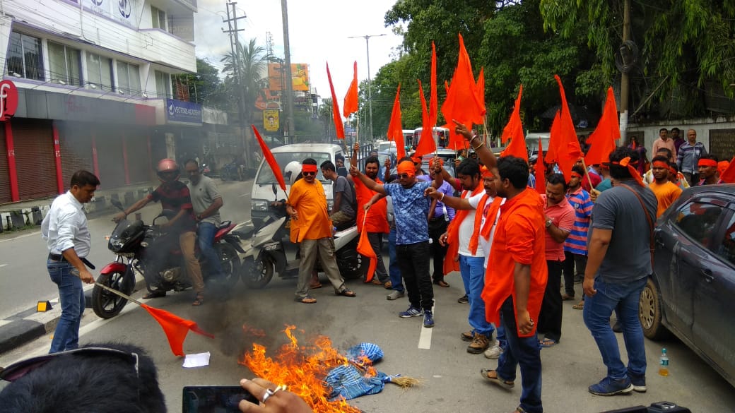 গুৱাহাটী, সংবাদ ৩৬৫, ১৫ জুলাইঃ গুৱাহাটীৰ মাছখোৱাস্থিত প্ৰাগজ্যোতিশ সংস্কৃতিক প্ৰকল্পত অহা ১৮ তাৰিখৰ পৰা দুদিনীয়া কাৰ্যসূচী অনুষ্ঠিত হ’ব লগীয়া বিশাল হিন্দু সমাবেশত আন্তঃৰাষ্ট্ৰীয় হিন্দু পৰিষদৰ ৰাষ্ট্ৰীয় অধ্যক্ষ ডাঃ প্ৰবীন ভাই টোগড়ীয়াক ৰাজ্য চৰকাৰে যোগদান কৰাৰ অনুমতি প্ৰদান নকৰক লৈ ক্ষোভিত হৈ পৰিছে আন্তঃৰাষ্ট্ৰীয় হিন্দু পৰিষদৰ আৰু ৰাষ্ট্ৰীয় বজৰংগ দল। ৰাজ্যৰ সৰ্বানন্দ সোনোৱালৰ নেতৃত্বাধীন বিজেপি চৰকাকৰ এই সিদ্ধান্তৰ বিৰুদ্ধে আন্তঃৰাষ্ট্ৰীয় হিন্দু পৰিষদৰ অসম শাখা আৰু ৰাষ্ট্ৰীয় বজৰংগ দলে প্ৰতিবাদ সাব্যস্ত কৰে। বিশাল হিন্দু সমাবেশত ডাঃ প্ৰবীন ভাই টোগড়ীয়াৰ প্ৰৱেশ নিষিদ্ধ কৰাৰ প্ৰতিবাদত আন্তঃৰাষ্ট্ৰীয় হিন্দু পৰিষদৰ অসম শাখা আৰু ৰাষ্ট্ৰীয় বজৰংগ দলে দেওবাৰে গুৱাহাটী প্ৰেছক্লাবৰ সন্মুখত প্ৰধানমন্ত্ৰী নৰেন্দ্ৰ মোদী আৰু মুখ্যমন্ত্ৰী সৰ্বানন্দ সোনোৱালৰ প্ৰতিমূৰ্তি দাহ কৰে। গুৱাহাটীৰ লগতে বৰপেটা জিলা বজৰং দলেও প্ৰধানমন্ত্ৰী নৰেন্দ্ৰ মোদী আৰু মুখ্যমন্ত্ৰী সৰ্বানন্দ সোণোৱালৰ প্ৰতিমূৰ্তি দাহ কৰি প্ৰতিবাদ সাব্যস্ত কৰে। বৰপেটা জিলা বজৰং দলে বিশাল হিন্দু সমাবেশত ডাঃ প্ৰবীন ভাই টোগড়ীয়াক প্ৰৱেশৰ অনুমতিৰ দাবী তুলি সোণোৱাল চৰকাৰক সকীয়াই দিয়ে যে যদি সমাবেশত ডাঃ প্ৰবীন ভাই টোগড়ীয়াক প্ৰৱেশৰ অনুমতি প্ৰদান কৰা নহয় তেন্তে অধিক কঠোৰ প্ৰতিবাদ গঢ়ি তোলা হ’ব।