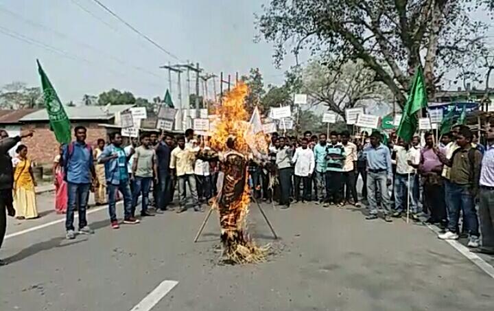 বাক্সা, সংবাদ ৩৬৫, মাৰ্চ: বাক্সা জিলাৰ তামুলপুৰৰ কুমাৰীকাটাত ভাৰত ভূটান ৰাষ্ট্ৰীয় ঘাইপথত বৃহস্পতিবাৰে ৰাতিপুৱা বাক্সা জিলা চাহ জনজাতি ছাত্ৰ সন্থা, চাওতাল ছাত্ৰ সন্থাই আদিবাসী ছাত্ৰ সন্থাৰ উদ্যোগত বিটিচি পৰিষদৰ শেহতীয়া ভূমিনীতিৰ প্ৰতিবাদত বিটিচি প্ৰধান হাগ্ৰামা মহিলাৰীৰ প্ৰতিকৃতি দাহ কৰে৷ প্ৰতিকৃতি দাহ কাৰ্যসূচীত তিনি ছাত্ৰ সংগঠনৰ নেতা কৰ্মী সকলে হাতে হাতে প্লেকাৰ্ড লৈ হাগ্ৰমা মহিলাৰী মূর্দাবাদ, বিটিচি চৰকাৰ গ বেক, আদিবাসী, চাওতাল আৰু চাহ জনজাতিৰ ভূমিনীতি বিৰোধী সকল হুচিয়াৰ, সংৰক্ষিত জাতিৰ মাটিৰ অধিকাৰ সুৰক্ষা কৰক, বিটিচিৰ ভূমিনিতী বাতিল কৰক, আমাৰ ন্যায্য দাবী মানি লওঁক, অসম চৰকাৰ হায় হায়, মোদী চৰকাৰ হায় হায়, আমাৰ ভূমি সংৰক্ষন কৰক, ভূমিৰ অধিকাৰ আমাৰ মৌলিক অধিকাৰ শ্লোগান দি কুমাৰীকাটাৰ ৰাজপথ উত্তাল কৰি তোলে ৷ ইপিনে এই ভূমিনীতিৰ বিৰোধিতা কৰি আদিবাসী মহাসভাই আহ্বান জনোৱা অসম বন্ধৰ ফলত কুমাৰীকাটাৰ দোকা পোহাৰ আৰু যানবাহন বন্ধ হৈ পৰে। বন্ধৰ ফলত জনজীৱন স্তব্ধ হৈ পৰে।