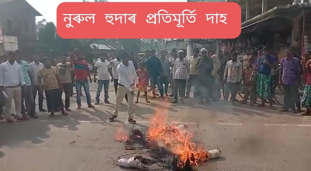 বিধায়ক নুৰুল হুদাৰ প্ৰতিমূৰ্তি দাহ কৰিলে বিজেপি কৰ্মীয়ে। নুৰুল হুদা মূর্দাবাদ, সূহৃদ আঁচনিৰ অনিযমৰ তদন্তৰ কৰক আদি শ্ল’গানেৰে উত্তাল হৈ পৰে ৰূপহী চাৰিআলিৰ মাজমজিয়া।