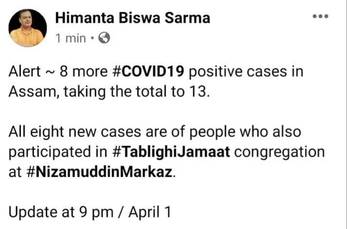 ইমান দিনে কভিড-১৯ কৰ’ণা ভাইৰাছৰ সংক্ৰমণৰ পৰা ৰক্ষা পৰি থকা অসমত এতিয়া দ্ৰুত গতিত বৃদ্ধি পাবলৈ ধৰিছে কভিড-১৯ কৰ’ণা ভাইৰাছৰ দ্বাৰা সংক্ৰমিত লোকৰ সংখ্যা। বুধবাৰে দিনৰ ভাগত স্বাস্থ্যমন্ত্ৰী হিমন্ত বিশ্ব শৰ্মাই ৰাজ্যত মাৰাত্মক কভিড-১৯ কৰ’ণা ভাইৰাছৰ দ্বাৰা আক্ৰান্ত লোকৰ সংখ্যা ৫ জনলৈ বৃদ্ধি পোৱা বুলি ঘোষণা কৰাৰ পিছতে নিশাৰ ভাগত মন্ত্ৰী গৰাকীয়ে এক টুইটযোগে প্ৰকাশ কৰে যে ৫ ৰ পৰা ১৩ লৈ বৃদ্ধি পাইছে আক্ৰান্তৰ সংখ্যা। সমগ্ৰ ভাৰততে কভিড-১৯ কৰ’ণা ভাইৰাছৰ সন্ত্ৰাস বিয়পি থকাৰ সময়তে অসম কিছু সম্পূৰ্ণ সংকটমুক্ত আছিল যদিও মঙলবাৰে ৰাজ্যৰ কৰিমগঞ্জ জিলাত ধৰা পৰে প্ৰথমজন কভিড-১৯ কৰ’ণা ভাইৰাছ আক্ৰান্ত এজন ৫২ বছৰীয়া লোক। বুধবাৰে দিনৰ ভাগত হিমন্ত বিশ্ব শৰ্মাই এক সংবাদমেল যোগে কৰ’ণা ভাইৰাছত আক্ৰান্ত লোকৰ সংখ্যা ৫ জনলৈ বৃদ্ধি হোৱা বুলি ঘোষণা কৰাৰ পিছতে নিশাৰ ভাগত আৰু ৮ জনকৈ লোকৰ শৰীৰত কভিড-১৯ কৰ’ণা ভাইৰাছৰ উপস্থিতি ধৰা পাৰত ৰাজ্যত আক্ৰান্তৰ সংখ্যা ১৩ জনলৈ বৃদ্ধি পাইছে।