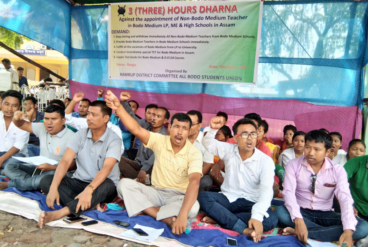 ৰঙিয়া, ১৫ ছেপ্টেম্বৰঃ বড়ো মাধ্যমৰ শৈক্ষিক সমস্যা সমাধানৰ দাবীত ৰঙিয়াৰ হৰদত্ত বীৰদত্ত ভৱনৰ সন্মুখত এবছুৰ কামৰূপ জিলা সমিতিয়ে উত্তাল প্ৰতিবাদ সাব্যস্ত কৰে। অবছুৱে বড়ো মাধ্যমৰ বিদ্যালয়সমূহত টেট শিক্ষক নিযুক্তি দিয়াৰ লগতে অন্য ভাষাৰ শিক্ষকৰ নিযুক্তি বন্ধ কৰাৰ দাবীত চৌদিশ উত্তাল কৰি তোলে৷ প্ৰতিবাদকাৰীসকলে মুখ্যমন্ত্ৰী সৰ্বানন্দ সোনোৱাল নেতৃত্বাধীন বিজেপি মিত্ৰজোঁটৰ চৰকাৰ আৰু শিক্ষা বিভাগক ক্ষুৰধাৰ সমালোচনা কৰে৷ লগতে ৰাজ্যত বৰ্তমানলৈ শাসনভাৰ গ্ৰহণ কৰা প্ৰতিখন চৰকাৰে বড়ো মাধ্যমক মাহী আইৰ দৃষ্টিৰে চোৱাৰ কাৰণে বড়ো জনগোষ্ঠীৰ ল’ৰা-ছোৱালীয়ে উপযুক্ত শিক্ষাৰ পৰা বঞ্চিত হ’বলগীয়া হোৱাৰ অভিযোগ উত্থাপন কৰে। প্ৰতিবাদকাৰীসকলে শীঘ্ৰে বড়ো মাধ্যমৰ বিদ্যালয়ত খালী হৈ থকা শিক্ষকৰ পদ পূৰণ কৰিবলৈ চৰকাৰক দাবী জনায়।