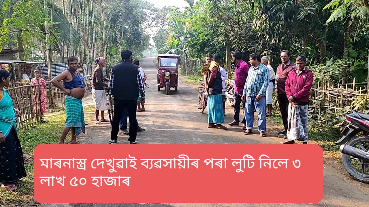 কামৰূপ জিলাৰ নগৰবেৰাত দিন দুপৰতে ডকাইতি কাণ্ড। মাৰনাস্ত্ৰ দেখুৱাই ব্যৱসায়ীৰ পৰা লুটি নিলে ৩ লাখ ৫০ হাজাৰ টকা।আনোৱাৰ হুছেইন নামৰ ব্যৱসায়ীৰ পৰা ডকাইতৰ দলে লুটি নিলে এই বৃহৎ ধন। বিগত দুনদিনত ৰাজ্যত সংঘটিত হৈছে কেইবাটাও ডকাইতি কাণ্ড।