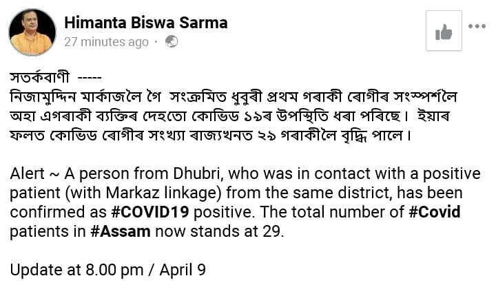 উল্লেখ্য যে, দিল্লীৰ নিজামুদ্দিন মাৰ্কজত অংশগ্ৰহ কৰা কৰিমগঞ্জ জিলাৰ জামালুদ্দিন নামৰ এজন লোকজন আছিল ৰাজ্যৰ প্ৰথমজন কৰ’ণা ভাইৰাছৰ দ্বাৰা আক্রান্ত ব্যক্তি। ৰাজ্যত মাৰাত্মক কৰ’ণা ভাইৰাছৰ দ্বাৰা আক্রান্ত সংখ্যা ২৯ লৈ বৃদ্ধি কৰা ধুবুৰী জিলাৰ বিলাসীপাৰাৰ হাকামাৰ বাসিন্দা ৰহিম উদ্দিনৰ দিল্লীৰ নিজামুদ্দিন মাৰ্কজত অংশগ্ৰহ কৰা ব্যক্তিৰ সংস্পৰ্শলৈ আহিছিল। আক্রান্ত ৰহিম উদ্দিনক বৰকান্দা হাইস্কুলত কোৱাৰাণ্টাইন কৰি ৰখা হৈছিল আৰু তেওঁৰ তেজৰ নমুনাৰ পৰীক্ষাৰ পিছত ব্যক্তিজন কৰ’ণা ভাইৰাছত আক্রান্ত বুলি স্পষ্ট হয়।