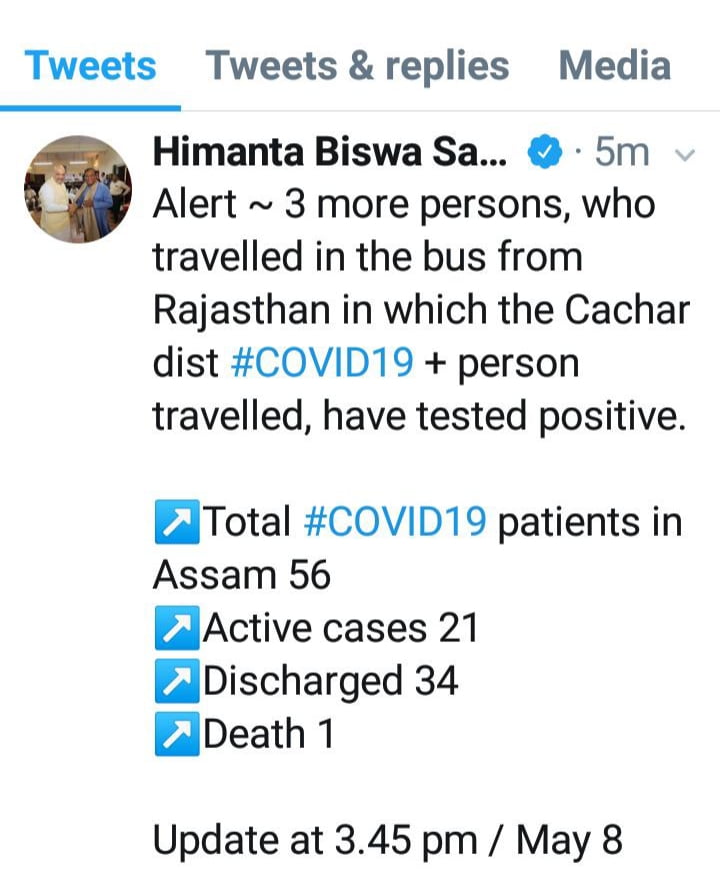 গুৱাহাটী, সংবাদ ৩৬৫, ৮ মে’ : ৰাজ্যত কভিড-১৯ কৰ’ণা ভাইৰাছত আক্ৰান্তৰ সংখ্যা ৫৬ লৈ বৃদ্ধি পালে। বৃহস্পতিবাৰে নিশা ৰাজ্যত ৮ জনকৈ লোকৰ শৰীৰত কৰ’ণা ভাইৰাছৰ উঅস্থিতি ধৰা পৰাৰ পিছত শুকুৰবাৰে দুপৰীয়াৰ ভাগত নতুনকৈ ৩ জন লোকৰ শৰীৰত ধৰা পৰিছে মাৰাত্মক কভিড-১৯ কৰ’ণা ভাইৰাছ। স্বাস্থ্যমন্ত্ৰী হিমন্ত বিশ্ব শৰ্মাই টুইট যোগ সদৰি কৰিলে ৩ জনকৈ লোক কৰ’ণা ভাইৰাছত আক্রান্ত হোৱাৰ কথা।