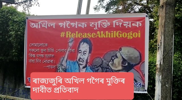 “কা” আন্দোলনৰ সক্ৰিয় নেতা অখিল গগৈ দীৰ্ঘদিন ধৰি কাৰাবন্দী হৈ আছে। বৃহস্পতিবাৰে অখিল গগৈৰ মুক্তিৰ দাবী জনাই কেইগৰাকী মান চিত্ৰশিল্পীয়ে মহানগৰীৰ গুৱাহাটীৰ লালমাটিত নিধি ভৱনৰ সন্মুখত এখন দলংৰ দেৱালত অংকন কৰিছিল অখিল গগৈৰ চিত্ৰ। দেৱালত অখিল গগৈৰ চিত্ৰ অংকনত চিত্ৰশিল্পী কেইগৰাকীক বশিষ্ঠ আৰক্ষীয়ে বাধা প্ৰদান কৰি আটক কৰিছিল চিত্ৰশিল্পী কেইগৰাকীক। বশিষ্ঠ আৰক্ষীয়ে অখিল গগৈৰ চিত্ৰ অংকনৰ অপৰাধত চিত্ৰশিল্পী কেইগৰাকীক আটক কৰা কাৰ্যৰ পিছতে ৰাজ্যজুৰি দেখিবলৈ পোৱা গৈছিল তীব্ৰ প্ৰতিক্ৰিয়াৰ। সামাজিক মাধ্যমত অখিল গগৈক সমৰ্থন জনাই আৰক্ষী তথা চৰকাৰক তীব্ৰ সমালোচনা কৰা পৰিলক্ষিত হৈছিল।