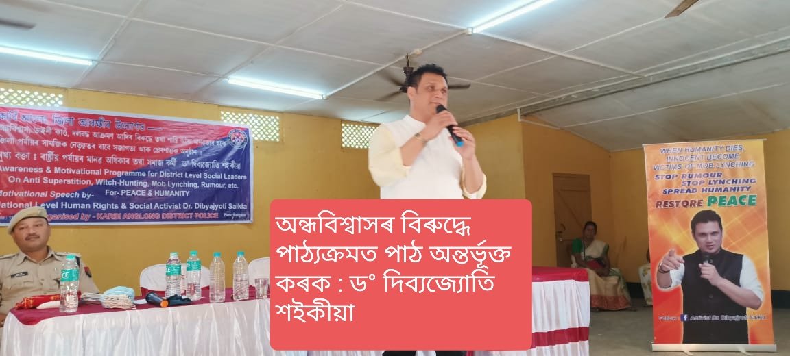 কাৰ্বি আংলং জিলা আৰক্ষীৰ উদ্যোগত অনুষ্ঠিত হোৱা অন্ধবিশ্বাস, ডাইনীকাণ্ড, আৰু দলবদ্ধ আক্ৰমণ’ শীৰ্ষক সজাগতা সভাত মুখ্য অতিথিৰ ভাষণত এই মন্তব্য কৰে ৰাষ্ট্ৰীয় মানৱ অধিকাৰ তথা সমাজ কৰ্মী ড° দিব্যজ্যোতি শইকীয়াই । তেওঁ লগতে আৰু কয় ৰাজ্যৰ প্ৰতিটো অঞ্চলৰ স্থানীয় সামাজিক নেতাসকলে অনুভৱ কৰাৰ লগতে অন্ধবিশ্বাস, ডাইনী কাণ্ড , দলব্দ্ধ আক্ৰমণ কিয় হয় জানি বুজি প্ৰতিৰোধৰ বাবে আগবাঢ়ি আহিব লাগিব। আমি জানিব লাগিব এই সমূহ কুসংস্কাৰৰ পৰা আমি কেনেকৈ মুক্তি লাভ কৰিব পাৰিম। সমাজৰ নেতৃত্ব প্ৰদান কৰা লোক সকলে নিজে জানি বুজিহে গ্ৰামঞ্চলৰ লোক সকলক সু-নেতৃত্ব প্ৰদান কৰিব লাগিব ।