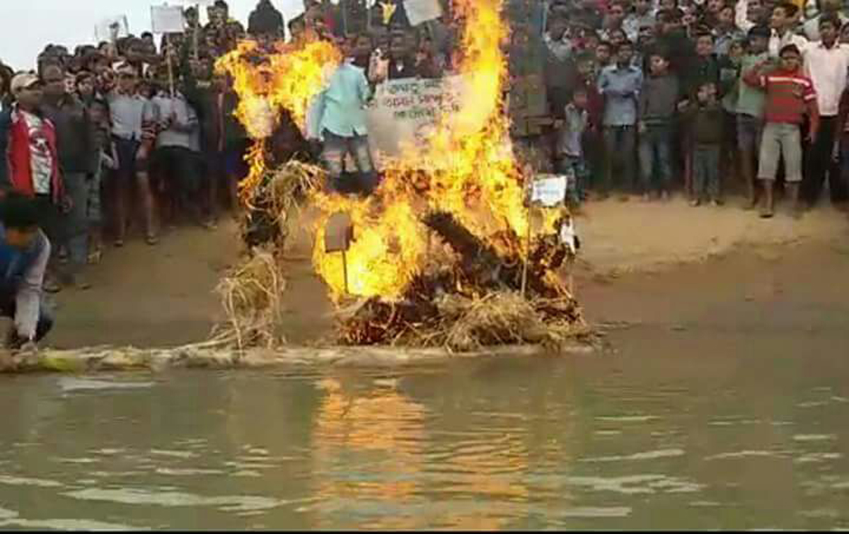 মিৰ্জাৰ পৰা অজয় দাস, সংবাদ ৩৬৫, ৩০ জানুৱাৰীঃ দক্ষিণ কামৰূপৰ কলহি নৈত মঙ্গলবাৰে অসমৰ ১২৬ গৰাকী বিধায়কৰ পু্ত্তলিকা দাহ কৰি উটুৱাই দিলে ৰাইজে। এখন দলং বিচাৰি কেইবাবাৰো ৰজাঘৰীয়াৰ ওচৰ চাপিও কোনো সুফল নাপাই ৰাইজে ১২৬ গৰাকী বিধায়কৰ পু্ত্তলিকা দাহ কৰি নৈত উটুৱাও দিয়ে। ৰাইজৰ অভিযোগ পলাশবাৰী সমষ্টিৰ বিধায়ক প্ৰণৱ কলিতা কেৱল নিৰ্বাচনৰন সময়ত ভোট বিচাৰি আহে আৰু নিৰ্বাচনত জয় হোৱাৰ পিছত প্ৰণৱ কলিতাই ৰাইজক পাহৰি যায়। বিধায়ক গৰাকীৰ ওচৰত এখন দলং বিচাৰি কেইবাবাৰো অনুৰোধ কৰাৰ পিছতো বিধায়ক গৰাকীয়ে কোনো গুৰুত্ব প্ৰদান নকৰাত ৰাইজ ক্ষোভিত হৈ বিধায়ক গৰাকীৰ লগতে অসমৰ ১২৬ গৰাকী বিধায়কৰ পু্ত্তলিকা দাহ কৰি নৈত উটুৱাই বিৰোধ প্ৰদর্শন কৰে। প্ৰণৱ কলিতা মূর্দাবাদ, সৰ্বানন্দ সোনোৱাল মূর্দাবাদ, অসম চৰকাৰৰ কাম নাই প্ৰতিবাদী ধ্বনিৰে প্ৰতিবাদকাৰীয়ে নদীৰ ঘাট উত্তাল কৰি তোলে। পলাশবাৰী সমষ্টিৰ পাৰঘাটবাসী ৰাইজ কলহি নদীৰ ওপৰত পাৰঘাট আৰু পানীখাইতিৰ ওপৰত এক দলং বিচাৰি কেইবাবাৰো স্থানীয় বিধায়ক আৰু বিভাগীয় কৰ্তৃপক্ষক অনুৰোধ জনাই আহিছে যদিও বিধায়ক তথা বিভাগীয় কর্তৃপক্ষই কোনো গুৰুত্ব প্ৰদান নকৰাত ৰাইজ ক্ষোভিত হৈ পৰে। নদীখনৰ ওপৰত সংযোগী দলং নথকাৰ বাবে অঞ্চলটোৰ প্ৰায় ১২ খনতকৈ অধিক গাঁৱৰ জনসাধাৰণে কেইবাবছৰ ধৰি দুৰ্ভোগ ভুগি আহিছে। ১২খনকৈ গাঁৱৰ জনসাধাৰণে উপায়হীন হৈ মঙ্গলবাৰে ওলাই আহি প্ৰতিবাদৰ আশ্ৰয় লয়। প্ৰতিবাদকাৰী সকলে দাবী জনায় যে অতি শীঘ্ৰে কলহি নৈৰ ওপৰত পাৰঘাট আৰু পানীখাইতি সংযোগী দলং নিৰ্মান কৰিব লাগে। যদি অতি শীঘ্ৰে প্ৰতিবাদকাৰী সকলৰ দাবী মানি লোৱা নহয় তেন্তে ৰাইজ জোৰ সমদল উলিয়াই ৰাজধানী দিছপুৰত প্ৰতিবাদ কৰিব। উল্লেখ্য যে নদীখনৰ ওপৰত দলং নথকাৰ বাবে কেইবাখনো বিদ্যালয়ৰ ছাত্ৰ ছাত্ৰীৰ লগতে সাধাৰণ ৰাইজ অতি বিপদসংকুল ভাৱে নাৱেৰে যাত্ৰা কৰিব লগা হয়। ৰাইজৰ প্ৰতি বৰ্তমান চৰকাৰখনে কোনো গুৰুত্ব প্ৰদান নকৰাৰ অভিযোগ কৰে ৰাইজে।