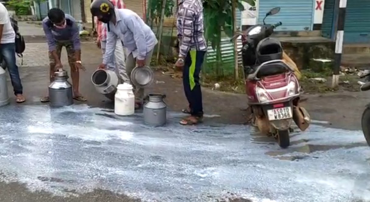 দেশজুৰি কৰ’ণা ভাইৰাছৰ ত্ৰাস দিনক দিনে বৃদ্ধি পোৱাৰ লগতে অসমতো ব্যাপক হাৰত বৃদ্ধি পাইছে কৰ’ণা ভাইৰাছৰ সংক্ৰমণ। ৰাজ্যত মহানগৰী গুৱাহাটীত কৰ’ণা ভাইৰাছত আক্রান্ত লোকৰ সংখ্যা সবাতোকৈ অধিক হোৱাৰ বাবে ৰাজ্য চৰকাৰে দেওবাৰে নিশাৰ পৰা গুৱাহাটী মহানগৰীত ১৪ দিনৰ বাবে লক ডাউন ঘোষণা কৰিছে। পূৰ্বৰ লক ডাউনতকৈ এইবাৰৰ লক ডাউনৰ ক্ষেত্ৰত ৰাজ্য চৰকাৰ অধিক কঠোৰ হৈ মহানগৰীত খাদ্য সামগ্ৰীৰ ব্যৱসায়ৰ ক্ষেত্ৰতো বাধা আৰোপ কৰিছে। চৰকাৰৰ নিৰ্দেশনা অনুসৰি সোমবাৰে পুৱাৰ ভাগত মহানগৰীৰ সকলো দোকান-বজাৰ বন্ধ থকাৰ লগতে ৰাজপথত যান বাহনৰ চলাচলো সম্পূৰ্ণৰূপে স্তব্ধ হৈ পৰা প্ৰিলক্ষিত হয়। ইয়াৰ মাজতে লক ডাউনৰ প্ৰথমটো পুৱাতে প্ৰতিবাদ সাব্যস্ত কৰা দেখিবলৈ পোৱা যায় মহানগৰীৰ গাখীৰ ব্যৱসায়ী সকলে। অত্যাৱশ্যকীয় সামগ্ৰীৰ মাজত পৰা গাখীৰ বিক্ৰীৰ ক্ষেত্ৰত আৰক্ষীয়ে গাখীৰ ব্যৱসায়ী সকলক বাধা প্ৰদান কৰাত গাখীৰ ব্যৱসায়ী সকল ক্ষোভিত হৈ প্ৰতিবাদত নামে। নাৰেংগী অঞ্চলত আৰক্ষীয়ে গাখীৰ ব্যৱসায়ী সকলক গাখীৰ বিক্ৰীত বাধা প্ৰদান কৰাত গাখীৰ ব্যৱসায়ী সকলে ৰাজপথৰ ওপৰত হাজাৰ হাজাৰ লিটাৰ গাখীৰ পেলাই দিয়ে। গাখীৰ ব্যৱসায়ী সকলে নাৰেংগীৰ ৰাজপথ গাখীৰেৰে উটুৱাই আৰক্ষীৰ বিৰুদ্ধে প্ৰতিবাদ সাব্যস্ত কৰে।