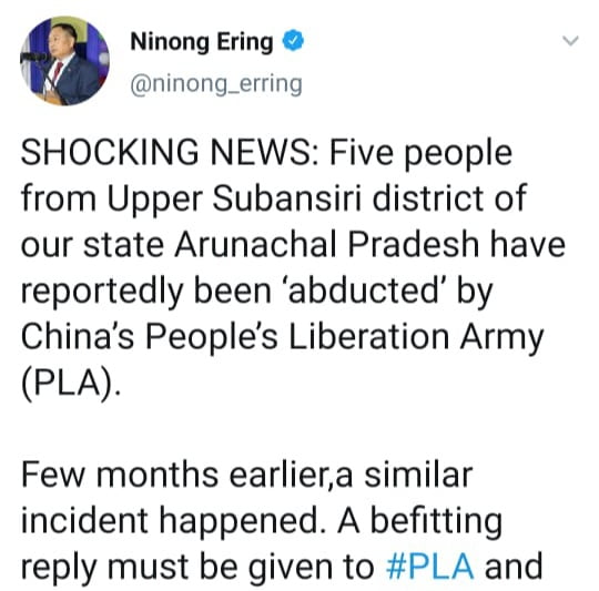 উল্লেখ্য যে অৰুণাচল প্ৰদেশৰ ভাৰত-চীন সীমান্তত বিগত আগষ্ট মাহৰে পৰা এক ভয়াবহ পৰিস্থিতি বিৰাজ কৰিছে। পাছিঘাটৰ বিধায়ক তথা কংগ্ৰেছৰ প্ৰাক্তন সাংসদ নিনং এৰিংৰ এই টুইটৰ পিছতে অৰুণাচল প্ৰদেশত তীব্ৰ চাঞ্চল্যৰ সৃষ্টি হোৱাৰ লগতে অৰুণাচল প্ৰদেশৰ ভাৰত-চীন সীমান্ত অভিমুখে যাত্ৰা আৰম্ভ কৰিছে অৰুণাচল প্ৰদেশৰ সোৱণশিৰীৰ ছাত্ৰ সংগঠনে।