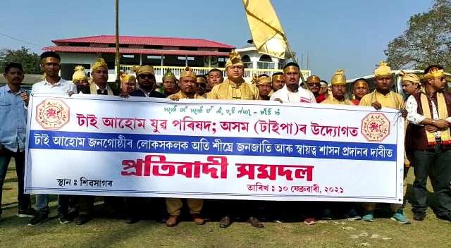 বুধবাৰে শিৱসাগৰত টাই আহোম যুৱ পৰিষদৰ কেন্দ্ৰিয় সমিতিয়ে জনজাতীকৰণৰ আৰু স্বায়ত্ব শাসনৰ প্ৰদান কৰাৰ দাবীত এক বৃহৎ প্ৰতিবাদী সমদল বাহিৰ কৰে। প্ৰতিবাদকাৰী সকলে শিৱসাগৰ নগৰৰ ষ্টেচন চাৰিআলি অৱস্থিত টাই আহোম সংস্কৃতিৰ বিকাশ কেন্দ্র পাংনৰ পৰা প্ৰতিবাদী সমদল উলিয়াই শিৱসাগৰ নগৰ ভ্ৰমণ কৰি জিলা উপায়ুক্ত কাৰ্যালয়ত উপস্থিত হয়। জিলা উপায়ুক্ত কাৰ্যালয়ৰ সন্মুখত প্ৰতিবাদকাৰী সকলে আমাক জনজাতিকৰণ প্ৰদনা কৰিবই লাগিব, আমাক স্বায়ত্ব শাসনৰ প্ৰদান কৰাৰ আদি শ্ল’গানেৰে পৰিৱেশ উত্তাল কৰি তোলে।