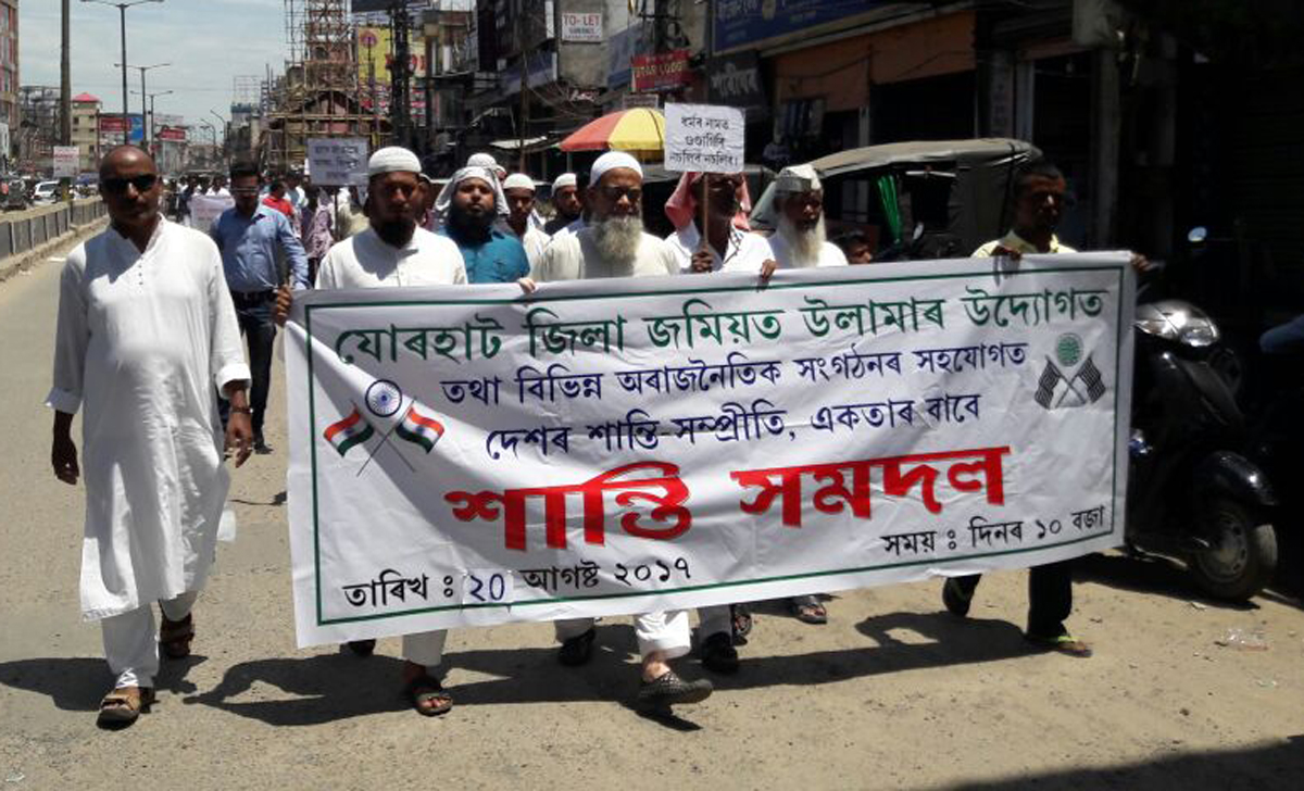 যোৰহাট, ২০ আগষ্টঃ স্বাধীনতা দিৱসৰ লগত সংগতি ৰাখি দেশৰ স্বাধীনতা যুঁজত প্ৰাণ আহুতি দিয়া বিভিন্ন ধৰ্মাৱলম্বী লোকসকলৰ আত্মবলিদানক যোৰহাটবাসীয়ে শ্ৰদ্ ধাৰে সোঁৱৰণ কৰে। পূৰ্ণ স্বাধীনতাৰ বাবে সৰ্বপ্ৰথমে আৱাজ বুলন্দ কৰা জমিয়ত উলামা ই হিন্দৰ ইতিহাস তথা ৫৭ হাজাৰ উলামাৰ শ্বহীদক সন্মান যাচি দেশত বিৰাজ কৰা হিংসা বিদ্বেষৰ বিৰুদ্ধে যোৰহাট জিলা জমিয়ত উলামাৰ উদ্যোগত এক শান্তি সমদল উলিওৱা হয়। শান্তি সমদলটো যোৰহাট চেন্ট্ৰেল ক্লাৱৰ পৰা ওলাই গড় আলি হৈ পুনৰ চেন্ট্ৰেল ক্লাৱতে সামৰণি হয়। এই শান্তি সমদলত বিভিন্ন গণতান্ত্ৰিক দল সংগঠন আৰু স্থানীয় ব্যক্তিয়ে অংশগ্ৰহণ কৰে।