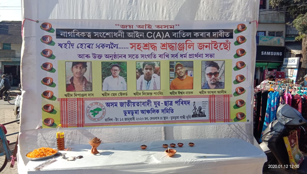 অসম জাতীয়তাবাদী যুৱ ছাত্ৰ পৰিষদ ডুমডুমা আঞ্চলিক সমিতিৰ উদোগত ডুমডুমাৰ গান্ধী মূৰ্ত্তি সমীপত “কা” বিৰোধী আন্দোলনত শ্বহীদ হোৱা জাতীয় শ্বহীদ সকলক সশ্ৰদ্ধ শ্ৰদ্ধাঞ্জলি জনোৱাৰ লগতে সৰ্ব ধৰ্মীয় প্ৰাৰ্থনাৰে শ্বহীদৰ আত্মাই চিৰশান্তি লাভ কৰে তাৰ কামনা কৰে ।