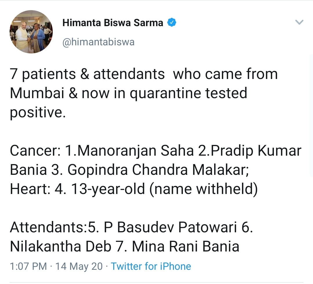 গুৱাহাটী, সংবাদ ৩৬৫, ১৪ মে’ : ৰাজ্যত আৰু ৭ গৰাকী লোকৰ শৰীৰত ধৰা পৰিছে কভিড-১৯ কৰ’ণা ভাইৰাছ। মুম্বাইৰ পৰা দুদিন পূৰ্বে অসমলৈ অহা কৰ্কট ৰোগী এইবাৰ আক্রান্ত হৈছে কভিড-১৯ কৰ’ণা ভাইৰাছত। আক্রান্ত লোক সকলৰ ভিতৰত তিনি গৰাকী কৰ্কট ৰোগী, এগৰাকী হৃদয় ৰোগত আক্রান্ত কিশোৰী আৰু তিনি গৰাকী কৰ্কট ৰোগীৰ আত্মীয়। স্বাস্থ্যমন্ত্ৰী হিমন্ত বিশ্ব শৰ্মাই নিজৰ টুইট যোগে ৰাজ্যত নতুনকৈ ৭ গৰাকীকৈ লোক কভিড-১৯ কৰ’ণা ভাইৰাছত আক্রান্ত হোৱা বুলি সদৰি কৰিছে।