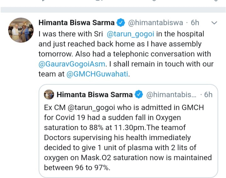 কৰ’ণা ভাইৰাছত আক্রান্ত হৈ গুৱাহাটী চিকিৎসা মহাবিদ্যালয় হাস্পতালত চিকিৎসাধীন অৱস্থাত থকা ৰাজ্যৰ প্ৰাক্তন মুখ্যমন্ত্ৰী তৰুণ গগৈৰ শৰীৰত সোমবাৰে নিশা হ্ৰাস পায় অক্সিজেনৰ মাত্ৰা। নিশা প্ৰায় ১১.৩০ বজাত প্ৰাক্তন মুখ্যমন্ত্ৰী গৰাকীক শৰীৰত অক্সিজেনৰ মাত্ৰা ৮৮% লৈ হ্ৰাস পোৱাত প্ৰাক্তন মুখ্যমন্ত্ৰী গৰাকীক ১ ইউনিত প্লাজমা আৰু অক্সিজেন প্ৰদান কৰা হয়। প্লাজমা আৰু অক্সিজেন প্ৰদানৰ পিছত প্ৰাক্তন মুখ্যমন্ত্ৰী গৰাকীক স্বাস্থ্য পুনৰ উন্নত হৈ শৰীৰত অক্সিজেনৰ ৯৭% লৈ বৃদ্ধি পায়। প্রাক্তন মুখ্যমন্ত্ৰী তৰুণ গগৈৰ স্বাস্থ্য সম্পৰ্কে টুইট যোগে এই কথা সদৰী কৰিছে স্বাস্থ্যমন্ত্ৰী হিমন্ত বিশ্ব শৰ্মাই। প্ৰাক্তন মুখ্যমন্ত্ৰী তৰুণ গগৈৰ স্বাস্থ্যৰ অৱনতি ঘটাত নিশাই গুৱাহাটী চিকিৎসা মহাবিদ্যালয় হাস্পতালত উপস্থিত হয় স্বাস্থ্যমন্ত্ৰী হিমন্ত বিশ্ব শৰ্মা। স্বাস্থ্যমন্ত্ৰী গৰাকীয়ে প্ৰাক্তন মুখ্যমন্ত্ৰী তৰুণ গগৈৰ স্বাস্থ্য সম্পৰ্কে গৌৰৱ গগৈৰ লগত টেলিফোন যোগে আলোচনা কৰাৰ কথাও টুইট যোগে প্ৰকাশ কৰে।