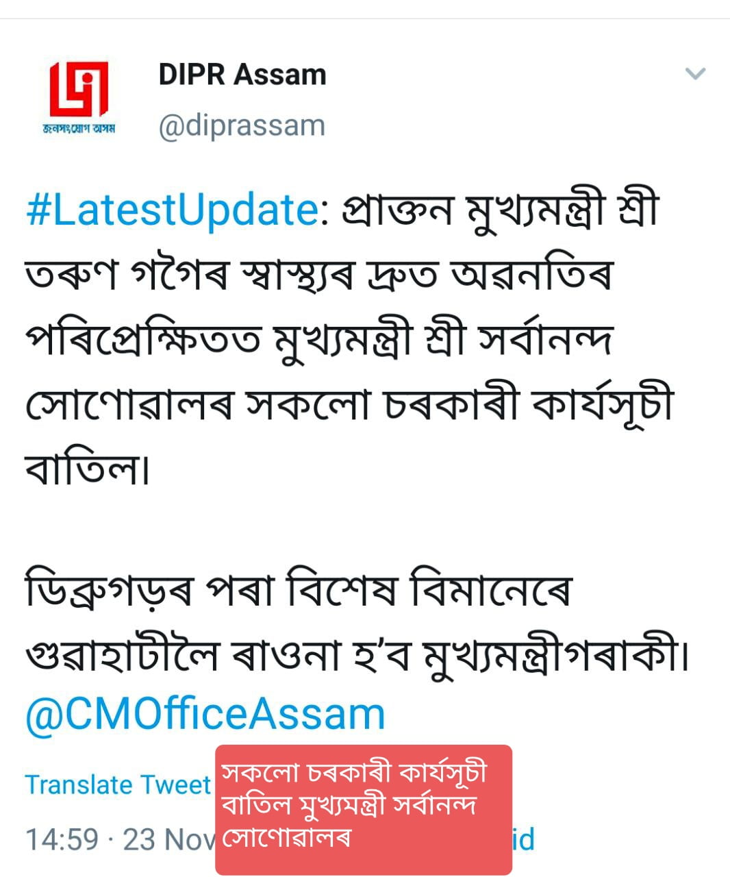 জনসংযোগ বিভাগৰ টুইটত প্ৰকাশ কৰা হৈছে যে “প্ৰাক্তন মুখ্যমন্ত্ৰী শ্ৰী তৰুণ গগৈৰ স্বাস্থ্যৰ দ্ৰুত অৱনতিৰ পৰিপ্ৰেক্ষিতত মুখ্যমন্ত্ৰী শ্ৰী সৰ্বানন্দ সোণোৱালৰ সকলো চৰকাৰী কাৰ্যসূচী বাতিল। ডিব্ৰুগড়ৰ পৰা বিশেষ বিমানেৰে গুৱাহাটীলৈ ৰাওনা হ’ব মুখ্যমন্ত্ৰী গৰাকী”।