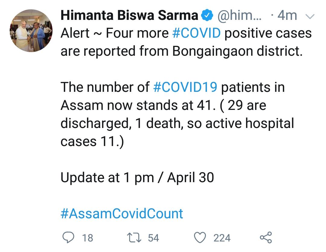 গুৱাহাটী, সংবাদ ৩৬৫, ৩০ এপ্ৰিল : বঙাইগাঁও জিলাৰ পৰা আহিছে বেয়া খবৰ। স্বাস্থ্যমন্ত্ৰী হিমন্ত বিশ্ব শৰ্মাই নিজৰ টুইটাৰ যোগে প্ৰকাশ কৰিলে এই বেয়া খবৰ। জিলাখনত বৃহস্পতিবাৰে একেগলে চাৰিজনকৈ লোকৰ শৰীৰত ধৰা পৰিছে কভিড-১৯ কৰ’ণা ভাইৰাছ। স্বাস্থ্যমন্ত্ৰীয়ে টুইট যোগে সদৰি কৰিলে এই খবৰ।