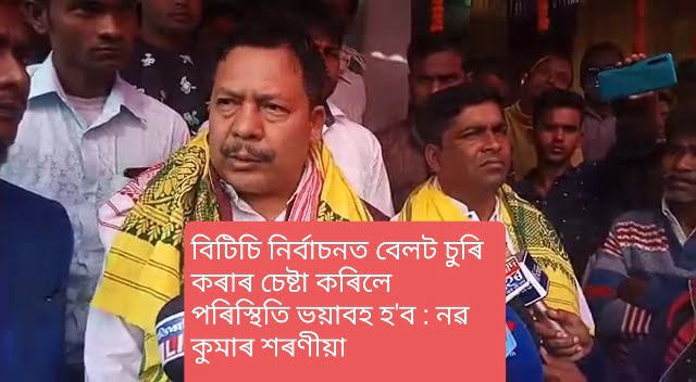 বিটিচি নিৰ্বাচনত যদি কোনো অনৈতিক পন্থা অৱলম্বন কৰি ভোট লুটৰ অপচেষ্টা চলোৱা হয় তেন্তে পৰিস্থিতি ভয়ানক হ’ব বুলি নৱ কুমাৰ শৰণীয়াই বিজেপি দলৰ প্ৰতি ইংগিতপূৰ্ণ মন্তব্য কৰে। ৰাইজে নিজেই মুক্ত আৰু নিকাভাৱে তথা সুষ্ঠু পৰিৱেশত নিৰ্বাচন অনুষ্ঠিত কৰাৰ ক্ষেত্ৰত তীক্ষ্ণ দৃষ্টি ৰখাৰ বাবেও তেওঁ বিটিচিবাসী ৰাইজক আহ্বান জনায়।