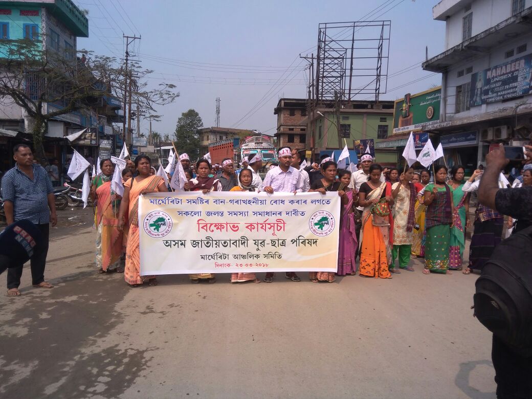 মাৰ্ঘেৰিটাৰ পৰা ৰবিন শৰ্মা, সংবাদ ৩৬৫, ২৩ মাৰ্চ: শুক্ৰবাৰে অসম জাতীয়তাবাদী যুৱ ছাত্ৰ পৰিষদৰ মাৰ্ঘেৰিটা সমিতিৰ উদ্যোগত এক প্ৰতিবাদী কাৰ্যসূচী গ্ৰহণ কৰা হয়। মাৰ্ঘেৰিটা সমষ্টিৰ বান, গৰাখহনীয়া ৰোধ কৰাৰ লগতে বিভিন্ন সমস্যা সমাধানৰ দাবীত জাতীয়তাবাদী যুৱ ছাত্ৰ পৰিষদৰ সদস্য সকলে এই প্ৰতিবাদী কাৰ্যসূচী গ্ৰহণ কৰাৰ লগতে মাৰ্ঘেৰিটাৰ বিধায়কক এখন প্ৰতিলিপি প্ৰেৰণ কৰে। প্ৰতিবাদী সকলে মাৰ্ঘেৰিটা সমষ্টিৰ ইনথেম গাওঁ পঞ্চায়তৰ এলেকাধীন মাইচাংপানী, লংগাঁৱৰ দিহিং নৈৰ পৰা খহনীয়াকে ধৰি সমষ্টিটোৰ অন্যান্য অঞ্চল সমূহৰ খহনীয়াৰ সমস্যা সমাধান কৰা, সমষ্টিটোৰ অন্তৰ্গত গাঁও সমূহৰ বাট পথ নিৰ্মাণ কৰা, মাৰ্ঘেৰিটা-লিডু- বৰগোলাইৰ জৰাজীৰ্ণ ৰাষ্ট্রীয় ঘাইপথ শীঘ্ৰে নিমাৰ্ণ কৰা, মাৰ্ঘেৰিটা মহকুমাৰ গাঁও সমূহত বৃদ্ধি পোৱা ড্ৰাগছ, কানিৰ অবৈধ ৰমৰমীয়া বেহা বন্ধ কৰা, মাৰ্ঘেৰিটা সমষ্টিত বিকল হৈ থকা বিশুদ্ধ খোৱাপানী যোগান আঁচনিবোৰ পুনৰ কাৰ্যক্ষম কৰাৰ দাবী জনায়।