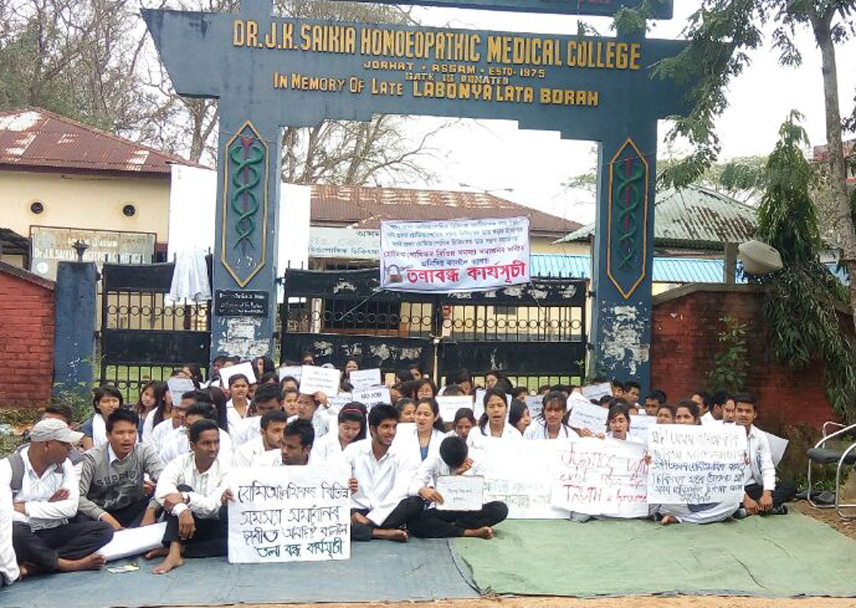 যোৰহাটৰ পৰা যুতিকা মহন্ত, সংবাদ ৩৬৫,  ৫ মাৰ্চ: যোৰহাটৰ জিলাৰ হোমিওপেথিক চিকিৎসা মহাবিদ্যালয়ৰ সমূহ ছাত্ৰ ছাত্ৰীয়ে সোমবাৰে তলাবন্ধ কাৰ্যসূচীৰ লগতে অৱস্থান ধৰ্মঘট কাৰ্যসূচী ৰূপায়ণ কৰে। উল্লেখ্য যে, যোৱা ২৮ ফেব্ৰুৱাৰীত গুৱাহাটীৰ দিশপুৰ লাষ্টগেটত অসমৰ হোমিওপেথিক চিকিৎসা মহাবিদ্যালয় সমূহৰ ছাত্র ছাত্ৰী সকলক আৰক্ষীয়ে কৰা লাঠি চাৰ্জৰ প্ৰতিবাদৰ লগতে অসমৰ হোমিওপেথিক চিকিৎসা মহাবিদ্যালয় সমূহৰ বিভিন্ন সমস্যা সমাধানৰ দাবীত যোৰহাটৰ জে.কে. শইকীয়া হোমিওপেথিক চিকিৎসা মহাবিদ্যালয়ৰ ছাত্ৰ ছাত্ৰী আৰু কণিষ্ঠ চিকিৎসক সকলে চিকিৎসা মহাবিদ্যালয় খন তলাবন্ধ কৰি দিয়া তিনি দিন অতিক্ৰম কৰাৰ পাছতো এই ক্ষেত্ৰত চৰকাৰৰ কোনো সহাৰি প্ৰদান কৰা নাই। ফলত ছাত্ৰ ছাত্ৰী আৰু কনিষ্ঠ চিকিৎসক সকলে মহাবিদ্যালয়খন তলা বন্ধ কৰি গেটৰ সন্মুখত অৱস্থান ধৰ্মঘট কাৰ্যসূচী পালন কৰি চৰকাৰ বিৰোধী ধৰ্ণাৰে পৰিবেশ উত্তাল কৰি তোলে। চৰকাৰে হোমিওপেথিক চিকিৎসা মহাবিদ্যালয়ৰ ছাত্ৰ ছাত্ৰী আৰু কনিষ্ঠ চিকিৎসকৰ দাবী মানি নলয়, তেন্তে অনিদিষ্ট কাললৈ চিকিৎসা মহাবিদ্যালয়খন তলাবন্ধ কৰি ৰাখিব বুলি ভাবুকি প্ৰদান কৰে।