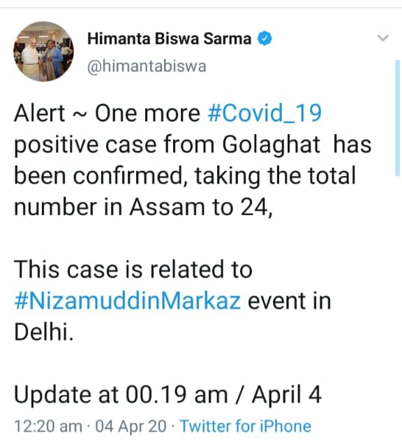 উল্লেখযোগ্য যে, দিল্লীত নিজামুদ্দিনৰ মাৰ্কাজত অংশগ্ৰহণ নকৰা জু–ৰোডৰ স্পেনিছ গাৰ্ডেন এপাৰ্টমেণ্টৰ এজন বাসিন্দাৰ শৰীৰত কৰ’ণা ভাইৰাছৰ উপস্থিতি পোৱা গৈছে শুকুৰবাৰে নিশাৰ ভাগত।