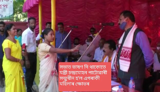 সভাত ভাষণ দি থাকোতে মন্ত্ৰী চন্দ্ৰমোহন পাটোৱাৰী সন্মুখীন হ’ল এগৰাকী মহিলাৰ ক্ষোভৰ। মন্ত্ৰী গৰাকীৰ সন্মুখতে মহিলা গৰাকীয়ে উদঙাই দিলে বিজেপিৰ আঁচনি সমূহত চলি থকা দালালৰাজ। বিজেপিৰ একাংশ কৰ্মীৰ সাংবাদিকক দৃশ্য গ্ৰহণ কৰাত বাধা প্ৰদান।