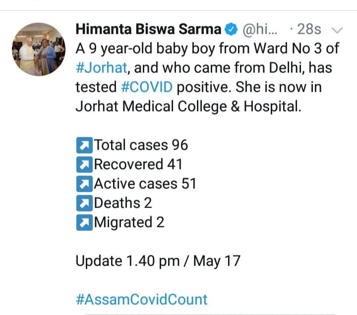 গুৱাহাটী, সংবাদ ৩৬৫, ১৭ মে’: যোৰহাট চিকিৎসা মহাবিদ্যালয় হাস্পতালত এগৰাকী ৯ বছৰীয়া শিশু আক্রান্ত হৈছে কবিড-১৯ কৰ’ণা ভাইৰাছত। স্বাস্থ্যমন্ত্রী হিমন্ত বিশ্ব শৰ্মাই নিজৰ টুইট যোগে সদৰি কৰিছে যে দিল্লীৰ পৰা অহা এগৰাকী ৯ বছৰীয়া শিশুৰ শৰীৰত ধৰা পৰিছে কভিড-১৯ কৰ’ণা ভাইৰাছ। শিশুটিক বৰ্তমান যোৰহাট চিকিৎসা মহাবিদ্যালয় হাস্পতালত চিকিৎসা প্ৰদান কৰা বাবে ৰখা হৈছে।