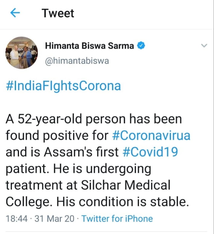 ভাৰতৰ অন্যান্য ৰাজ্য সমূহৰ তুলনাত উত্তৰ পূৰ্বাঞ্চল মাৰাত্মক কভিড-১৯ কৰ’ণা ভাইৰাছৰ সংক্ৰমণৰ পৰা কিছু ৰক্ষা পৰি আছিল যদিও মণিপুৰ আৰু মিজোৰামৰ পিছত এইবাৰ অসমত ধৰা পৰিল কভিড-১৯ কৰ’ণা ভাইৰাছত আক্রান্ত লোক। মঙলবাৰে ৰাজ্যৰ স্বাস্থ্যমন্ত্ৰী হিমন্ত বিশ্ব শৰ্মাই এক টুইটযোগে ৰাজ্যৰ প্ৰথটো কভিড-১৯ কৰ’ণা ভাইৰাছ আক্রান্ত লোকৰ বিষয়ে নিশ্চিত কৰে। মন্ত্ৰী গৰাকীয়ে নিজৰ টুইটত কৰিমগঞ্জ জিলাৰ ৫২ বছৰীয়ে এজন লোকৰ শৰীৰত কভিড-১৯ কৰ’ণা ভাইৰাছৰ থকা বুলি ঘোষণা কৰে। আক্রান্ত লোকজন কিদুমান পূৰ্বে দিল্লীৰ পৰা ৰাজ্যলৈ আহিছিল। দিল্লীৰ পৰা ৰাজ্যলৈ অহাৰ পিছত লোকজন জ্বৰত আক্রান্ত হৈছিল আৰু যোৱা ১৮ মাৰ্চ তাৰিকে লোকজনৰ তেজৰ নমুনা পৰীক্ষা কৰিবলৈ মহাৰাষ্ট্ৰৰ পুনলৈ প্ৰেৰণ কৰা হৈছিল। তেজৰ নমুনা পৰীক্ষা কৰাৰ পিছত লোকজন কভিড-১৯ কৰ’ণা ভাইৰাছত আক্রান্ত বুলি নিশ্চিত হৈছে। বৰ্তমান কভিড-১৯ কৰ’ণা ভাইৰাছত আক্রান্ত লোকজনক শিলচৰ মেডিকেল কলেজ হাস্পতালত আছুতীয়া কক্ষত ৰাখি চিকিৎসা প্ৰদান কৰা হৈছে।