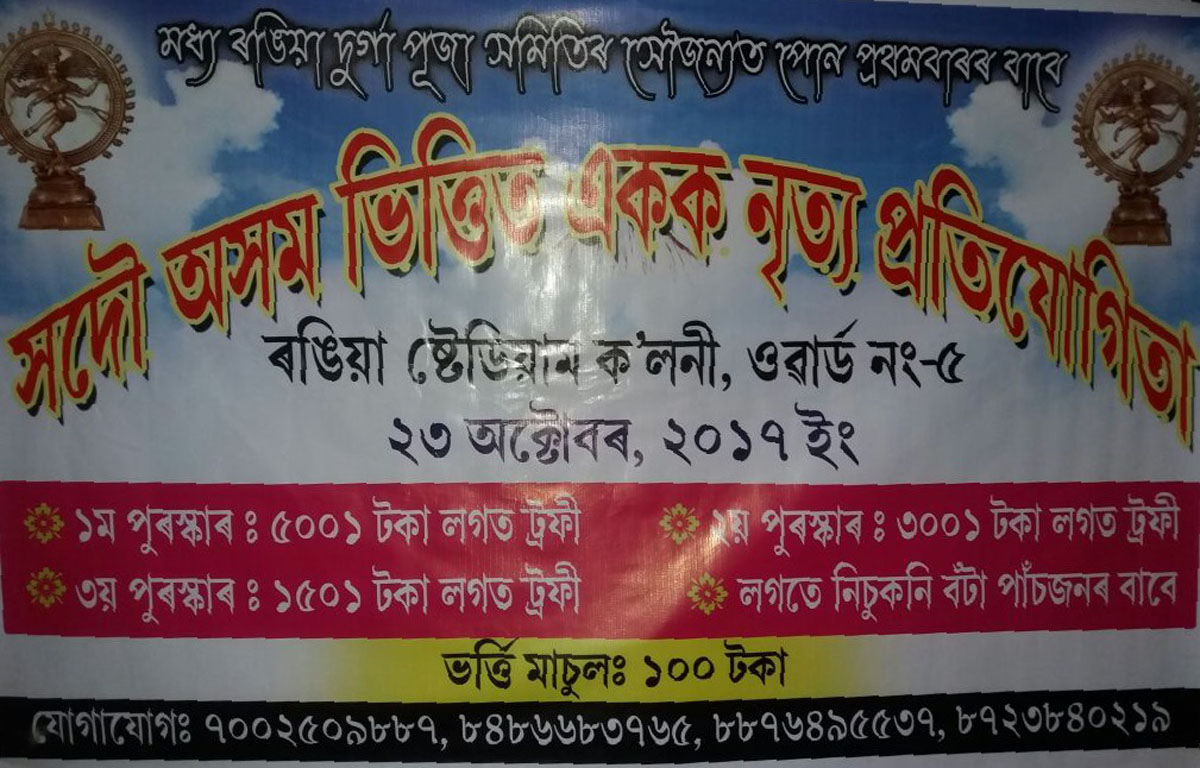 ৰঙিয়া, ২১ অক্টোবৰঃ মধ্য ৰঙিয়া দুৰ্গা পূজা সমিতিৰ উদ্যোগত ষ্টেডিয়াম কলনিত ২৩ অক্টোবৰত সদৌ অসম ভিত্তিক নৃত্য প্ৰতিযোগিতাৰ আয়োজন কৰা হৈছে। শ্ৰেষ্ঠ বিবেচিত প্ৰথম তিনিগৰাকী নৃত্য প্ৰতিযোগীক নগদ ধনেৰে পুৰস্কৃত কৰিব। প্ৰথম তিনিগৰাকী বিজয়ী প্ৰতিযোগিতাক ক্ৰমে ৫,০০১ টকা , ৩,০০১ টকা আৰু ১,০০১ টকাৰে পুৰস্কৃত কৰা হ’ব । ইচ্ছুক প্ৰতিযোগীসকলক সম্পাদক অভিজিৎ কলিতাৰ লগত ৭০০২৫০৯৮৮৭ নম্বৰত যোগাযোগ কৰিব পাৰিব।