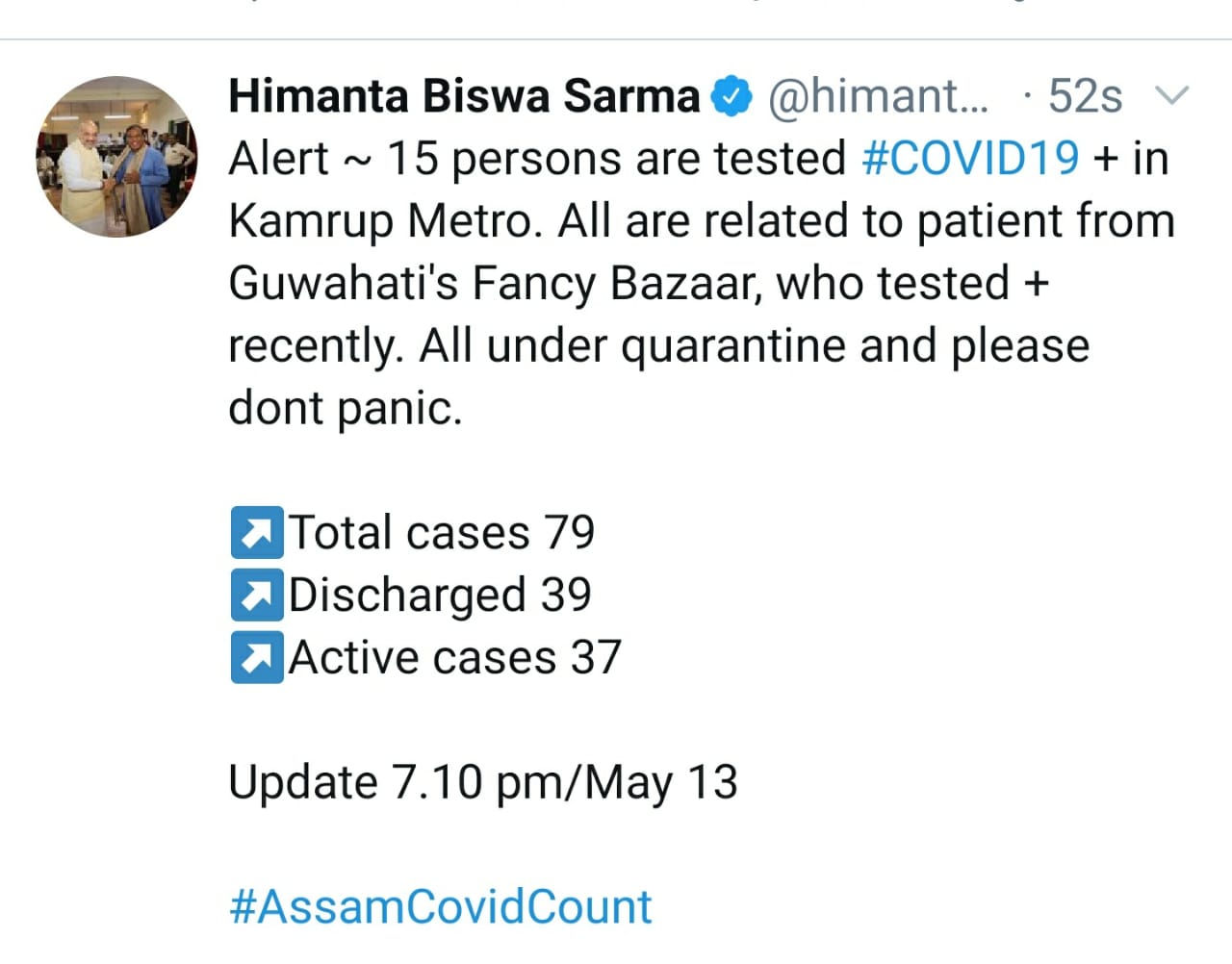 গুৱাহাটী, সংবাদ ৩৬৫, ১৩ মে’ : ৰাজ্যত কভিড-১৯ কৰ’ণা ভাইৰাছত আক্রান্ত লোকৰ সংখ্যা ৭৯ লৈ বৃদ্ধি পাইছে। কামৰূপ মহানগৰ জিলাত বুধবাৰে একেলগে ১৫ জন লোক আক্রান্ত হৈছে কভিড-১৯ কৰ’ণা ভাইৰাছত। ৰাজ্যৰ স্বাস্থ্যমন্ত্ৰী হিমন্ত বিশ্ব শৰ্মাই নিজৰ টুইট যোগে সদৰি কৰিলে কামৰূপ মহানগৰ জিলাত নতুনকৈ ১৫ জন লোক আক্রান্ত হোৱাৰ কথা।