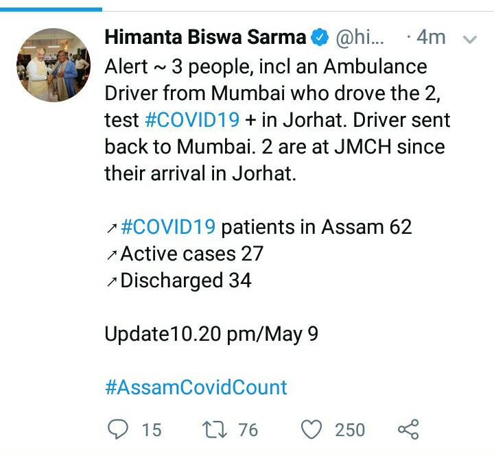 গুৱাহাটী, সংবাদ ৩৬৫, ১০ মে’ : অসমত কভিড-১৯ কৰ’ণা ভাইৰাছত আক্রান্ত সংখ্যা ৬২ লৈ বৃদ্ধি পাইছে। যোৰহাট জিলাৰ দুগৰাকী মহিলা নতুনকৈ কভিড-১৯ কৰ’ণা ভাইৰাছত আক্রান্ত হোৱা বুলি টুইট যোগে সদৰি কৰিছে স্বাস্থ্যমন্ত্রী হিমন্ত বিশ্ব শৰ্মা।