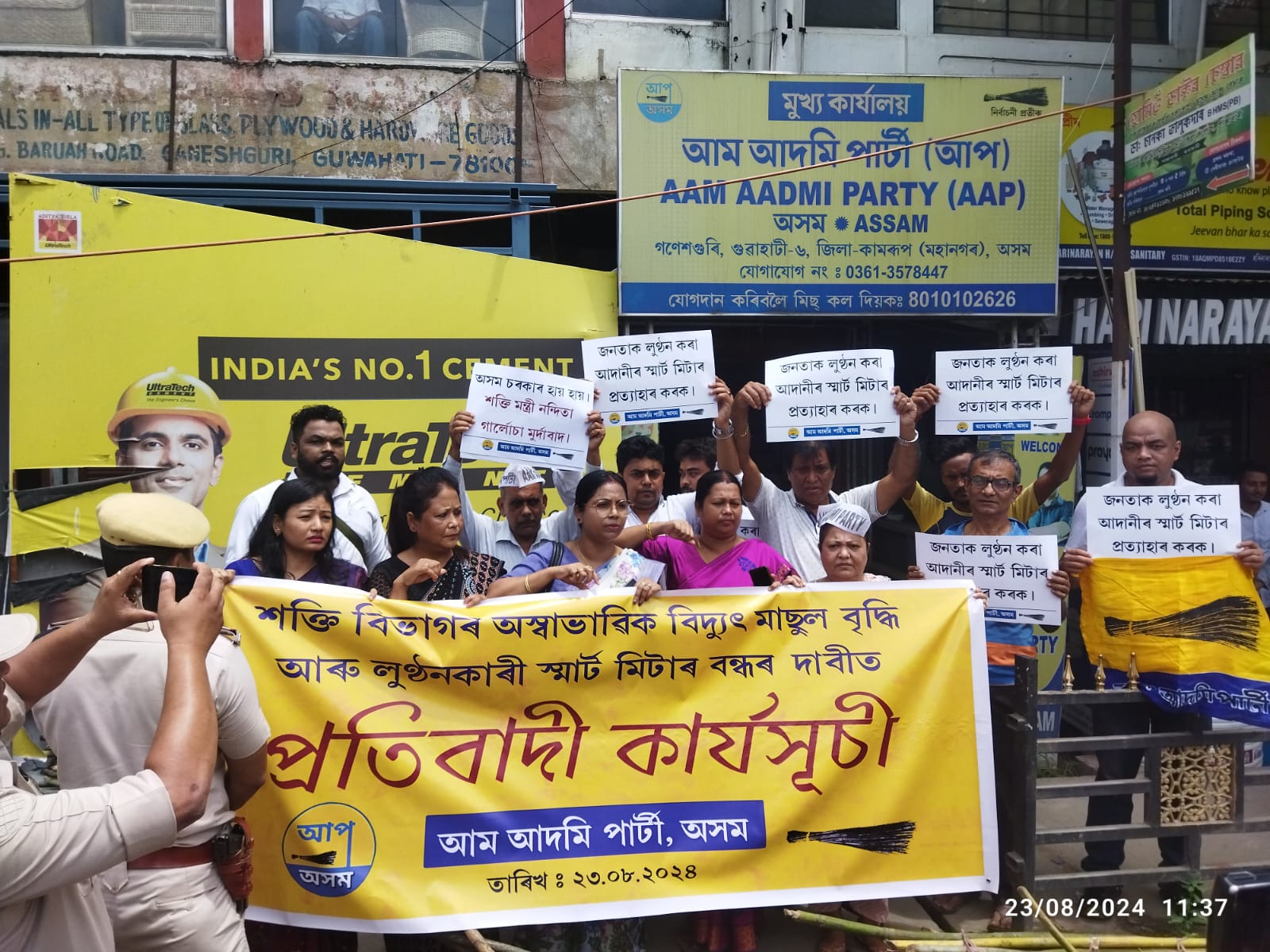 গণেশগুৰিস্থিত আপৰ ৰাজ্যিক কাৰ্যালয়ৰ সন্মুখত বহুসংখ্যক দলীয় কৰ্মীয়ে প্ৰতিবাদী কাৰ্যসূচীত অংশগ্ৰহণ কৰে। হাতে হাতে প্লেকাৰ্ড লৈ আপৰ নেতা-কৰ্মী সকলে স্মাৰ্ট মিটাৰ প্ৰত্যাহাৰ কৰক, আদানী স্মাৰ্ট মিটাৰ নচলিব, শক্তি মন্ত্ৰী নন্দিতা গাৰ্লোচা হুচিয়াৰ আদি শ্ল’গানেৰে বিক্ষোভ প্ৰদৰ্শন কৰি পৰিৱেশ উত্তাল কৰি তোলে।