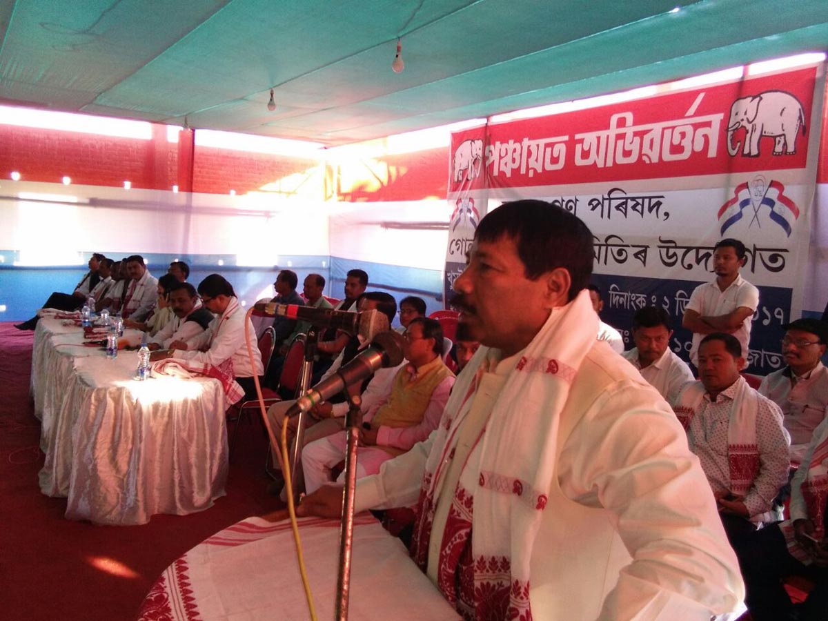 দেৰগাওঁ ২ ডিচেম্বৰঃ আগন্তুক পঞ্চায়ত নিৰ্বাচনৰ দিন যিমানেই চমু চাপিছে সিমানেই তৎপৰতা বৃদ্ধি পাইছে ৰাজনৈতিক দল সমূহৰ মাজত। বিজেপি, কংগ্ৰেছৰ লগতে ৰাজ্যৰ প্ৰধান আঞ্চলিক দল অগপৰ নেতা আৰু কৰ্মীসকল পঞ্চায়ত নিৰ্বাচনৰ বাবে টঙালি বান্ধিছে কঁকালত। আজি প্ৰায় পাঁচ সহস্ৰাধিক দলীয় কৰ্মীৰ উপস্থিতিত অগপৰ জন্ম স্থান গোলাঘাটৰ খুমটাই সমষ্টিৰ টেকিয়ালত ৰাজ্যৰ প্ৰধান আঞ্চলিক দলটোৱে নিজৰ শক্তি প্ৰৰ্দশন কৰে। এসময়ত অগপৰ দূৰ্গস্বৰূপ খুমটাই সমষ্টি বৰ্ত্তমান মিত্ৰ দল বিজেপিৰ দখলত যদিও খুমটাই সমষ্টিৰ পঞ্চায়তসমূহ নিজৰ দখললৈ আনিবলৈ যুজঁ চলাইছে দলটোৰ নেতাসকল। খুমটাইৰ ঢেকিয়ালত দিনৰ ১০ বজাত দলীয় পাতাকা উওোলন কাৰ্যসূচীৰে আৰম্ভ হয় অগপৰ পঞ্চায়ত অভিৱৰ্তন। পাতাকা উওোলন কৰে জিলা অগপৰ সভাপতি পৱন শইকীয়াই, শ্বহীদ তৰ্পণ কাৰ্যসূচী মুকলি কৰে জিলা সম্পাদক আছিকুৰ ৰহমানে। অভিৱৰ্তন কাৰ্যসূচীত উপস্থিত থাকে অগপৰ কেন্দ্ৰীয় সমিতিৰ সভাপতি তথা কৃষিমন্ত্ৰী অতুল বৰা, অগপৰ জেষ্ঠ নেতা তথা বঙাইগাওঁ সমষ্টিৰ বিধায়ক ফণীভূষণ চৌধুৰী, টিয়ক সমষ্টিৰ বিধায়িকা ৰেণুপমা ৰাজখোৱা, অগপৰ কেন্দ্ৰীয় সমিতিৰ সম্পাদক নুৰুল চুলতান। অসম যুৱ পৰিষদৰ সভাপতি সুনীল বৰা, কাৰ্যকৰী সভাপতি জিতু বঢ়াগোহাঁই, সাধাৰণ সম্পাদক পৰেশ গগৈ, অসম মহিলা পৰিষদৰ সভানেত্ৰী বৰদা শইকীয়াৰ লগতে বহু শীৰ্ষ স্থানীয় নেতাই এই সভাখনত অংশগ্ৰহণ কৰে। সভাখনত ভাষণ প্ৰদান কৰি অগপৰ সভাপতি তথা কৃষিমন্ত্ৰী অতুল বৰাই কংগ্ৰেছৰ দখলত থকা প্ৰায়বোৰ পঞ্চায়তত অনিয়ম, দুৰ্নীতি, ৰাজহুৱা ধনৰ অপচয় হোৱাৰ অভিযোগ কৰি কয় যে আগন্তুক দিনত নিকা আৰু দুৰ্নীতিমুক্ত পঞ্চায়ত গঠন কৰাৰ স্বাৰ্থত অগপ দলক শক্তিশালী কৰিব লাগিব। কৃষিমন্ত্ৰীয়ে এই ক্ষেত্রত দলৰ তৃণমূল কৰ্মীসকলে দলীয় সাংগাঠনিক ভেটি মজবুত কৰি দলটোক ৰাইজৰ মাজলৈ আগুৱাই নিবলৈ আহ্বান জনায়। পূৰ্বৰ কংগ্ৰেছ চৰকাৰখনক উৎসাত কৰাৰ স্বাৰ্থতে অগপ দলটোৱে বিজেপিৰ লগত যোৱা বিধানসভা নিৰ্বাচনত মিত্ৰতা কৰিছিল। শেহতীয়াকৈ উচ্চতম ন্যায়লয়ে ৰাষ্ট্রীয় নাগৰিক পঞ্জীৰ কাম ৩১ ডিচেম্বৰ ভিতৰত কৰিবলৈ দিয়া নিৰ্দেশক অগপই আদৰণি জনাইছে। বৃহৎ নাগালিমত অসমৰ এক ইঞ্চিও মাটি অন্তভুক্ত হবলৈ দিয়া নহব বুলি মন্তব্য কৰি নগা চুক্তি ৰাজহুৱা কৰিবলৈ আহ্বান জনায় কৃষিমন্ত্ৰী গৰাকীয়ে। আজিৰ এই অভিৱৰ্তন সভাত উপস্থিত থাকি অগপৰ জেষ্ঠ বিধায়ক ফণীভূষণ চৌধুৰীয়ে পঞ্চায়ত নিৰ্বাচনত দলে অকলে অৱতীৰ্ণ হোৱা মতপোষণ কৰা বুলি জানিবলৈ দিয়ে। আজিৰ সভাত ৰাইজৰ উপস্থিতি দেখি কব পাৰি যে অগপ দলৰ দুৰ্বল হৈ পৰা ভেটি সমষ্টিখনত পুনৰ শক্তিশালী হবলৈ ধৰিছে। কিন্তু সমষ্টিৰ দলীয় সাংগাঠনিক কামৰ ক্ষেত্ৰত অগপতকৈ কোনো গুণে কম নহয় কংগ