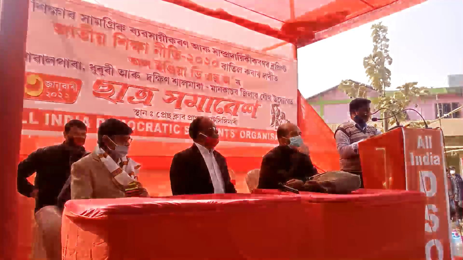 দেশত জাতীয় শিক্ষানীতি ২০২০ বাতিলৰ দাবীত দক্ষিণ শালমাৰা-মানকাচৰ জিলাৰ সদৰস্থিত হাটশিঙিমাৰী প্ৰেছ ক্লাব প্ৰাঙ্গনত অল ইণ্ডিয়া ডেমক্ৰেটিক ষ্টুডেণ্ট অৰগেনাইজেশ্বনৰ এক ছাত্ৰ সমাৱেশ অনুষ্ঠিত হয়। অল ইণ্ডিয়া ডেমক্ৰেটিক ষ্টুডেণ্ট অৰগেনাইজেশ্বন চমুকৈ এআইডি এছঅ’ৰ আহ্বানত গোৱালপাৰা, ধুবুৰী আৰু দক্ষিণ শালমাৰা-মানকাচৰ জিলা কমিটিৰ যৌথ উদ্যোগত অনুষ্ঠিত হোৱা এই ছাত্ৰ সমাৱেশত মুখ্য বক্তা হিচাপে উপস্থিত থাকে সৰ্ব ভাৰতীয় সাধাৰণ সম্পাদক সৌৰভ ঘোষ।
