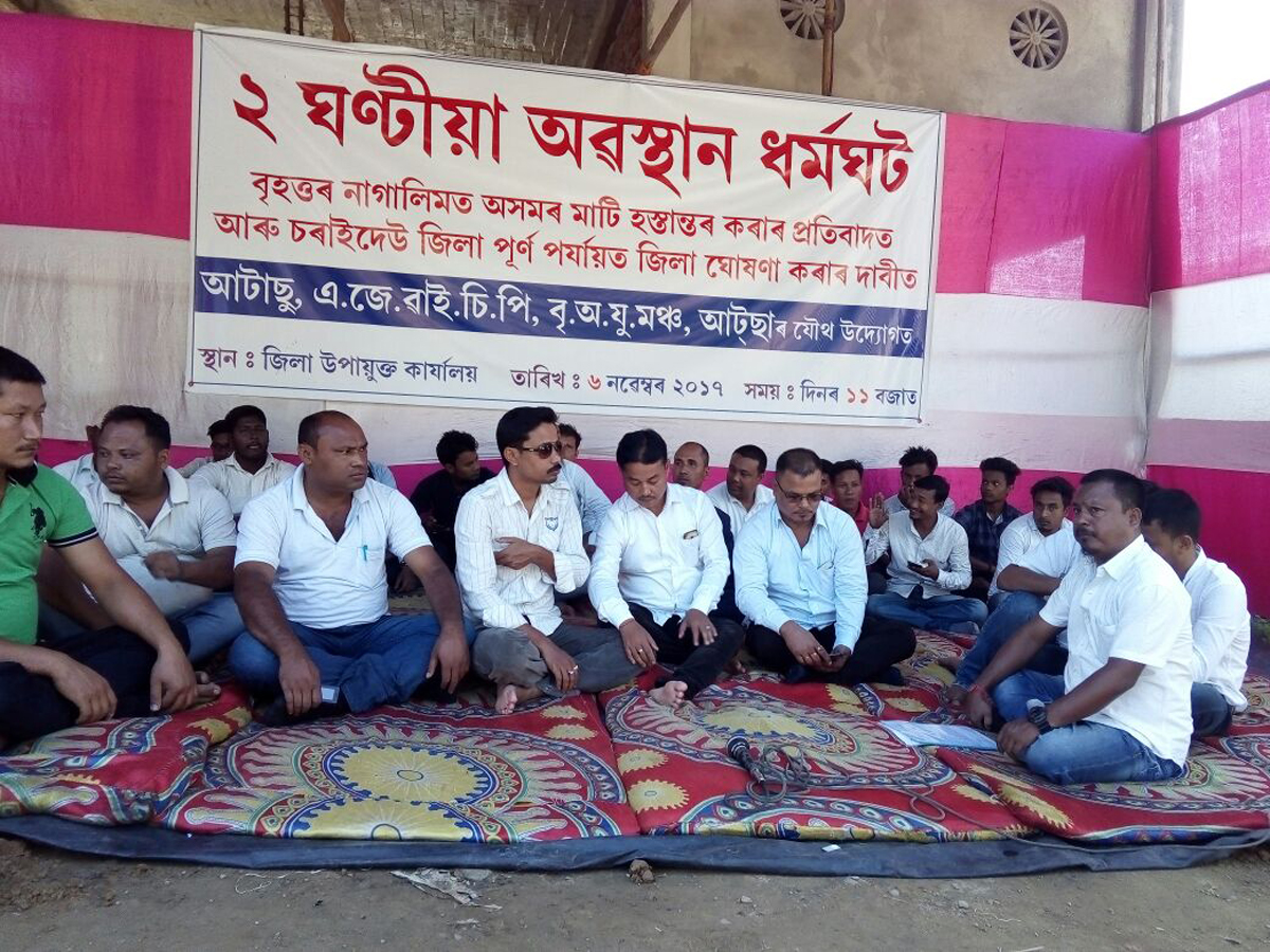 সোনাৰি, নৱেম্বৰ ৬: বৃহত্তৰ নাগালিমত অসমৰ মাটি হস্তান্তৰৰ প্ৰতিবাদত আৰু চৰাইদেউ জিলাক পূৰ্ণ পৰ্যায়ৰ জিলা হিচাপে ঘোষণা কৰাৰ দাবীত সোণাৰিত চৰাইদেউ জিলা উপায়ুক্ত কাৰ্যালয়ৰ সন্মুখত দুঘণ্টীয়া এক অৱস্থান ধৰ্মঘট কাৰ্যসূচী ৰূপায়ন কৰা হয়৷ দিনৰ এঘাৰ বজাৰপৰা আৰম্ভ কৰা এই ধৰ্মঘট কাৰ্যসূচী সদৌ টাই আহোম ছাত্ৰ সন্থা, অসম জাতীয়তাবাদী যুৱ ছাত্ৰ পৰিষদ, বৃহত্তৰ অসমীয়া যুৱ মঞ্চ আৰু অসম চাহ জনজাতি ছাত্ৰ সন্থাৰ যৌথ উদ্যোগত ৰূপায়ণ কৰা হয়৷ উল্লেখ্য যে, আন্ত:দেশীয় আৰু ভগ্নী ৰাজ্যসমূহৰ কেঁকুৰা চেপাত অৱশিষ্ট অসমৰ মানচিত্ৰ ইতিমধ্যে সংকুচিত হৈছে৷ এই মূহুৰ্তত যিকোনো কাৰণত অসমৰ এক ইঞ্চি মাটিও যাতে বৃহত্তৰ নাগালিমৰ অন্তভুক্ত নহয় তাৰ বাবে দাবী জনাই ১৯৬৩ চনৰ নাগালেণ্ড গঠনৰ যি চাৰিসীমা তাক কাৰ্যকৰী কৰি অসমৰ সীমা সমস্যা সমাধান কৰাৰ দাবী জনায়৷ ইপিনে চৰাইদেউ জিলা ঘোষণা কৰা হ’ল যদিও নাম মাত্ৰ জিলাৰ কাম-কাজ চলি থকাৰ বাহিৰে আজি পৰ্যন্ত পূৰ্ণাংগ জিলাৰ আন্ত:গাঁঠনি সম্পূৰ্ণ নোহোৱাৰ প্ৰতিবাদ জনোৱাৰ লগতে অতিশীঘ্ৰে চৰাইদেউ জিলাৰ সঠিক সীমা নিৰ্ধাৰণ কৰাৰ লগতে আন্ত:গাঁঠনি সবল কৰি পূৰ্ণাংগ জিলালৈ উন্নীত কৰিবলৈ দাবী জনায়৷