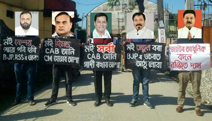 মই সৰ্বানন্দ সোণোৱাল কেব আনি গাদী ৰখাৰ আশা, মই হিমন্ত কেব আনি চি এম হোৱাৰ আশা, মই অতুল বৰা বিজেপিৰ ওচৰত আঁঠু লোৱা , জাতিৰ আধুনিক বদন ৰঞ্জিত দাস, মই কেশৱ পাৱে পৰি হৰি বিজেপি আৰ এছ এছৰ ওচৰত আদি লিখা প্লে কাৰ্ডৰ সৈতে প্ৰতিকৃতি লৈ প্ৰতিবাদ সাব্যস্ত কৰে ।