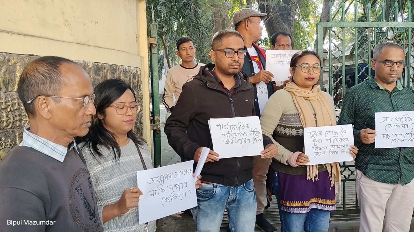 গুৱাহাটী, ৩১ ডিচেম্বৰ, ২০২৩ : গুৱাহাটী প্ৰেছ ক্লাবৰ সন্মুখত সাংবাদিকৰ প্ৰতিবাদ। ডাম্পাৰৰ খুন্দাত নিহত সাংবাদিক পাৰ্থজ্যোতি দাসৰ (Journalist Parthajyoti Das) পৰিয়ালক উচিত ক্ষতিপূৰণ তথা চৰকাৰী চাকৰি প্ৰদানৰ দাবী। সুৰাৰ গোন্ধ শুঙি ফূৰা পৰিবহন বিভাগৰ বিয়াগোম বিষয়া ডাম্পাৰৰ চালকক নাকী লগোৱাত কিয় ব্যৰ্থ বুলি প্ৰশ্ন সাংবাদিক হেমন্ত শৰ্মাৰ।
