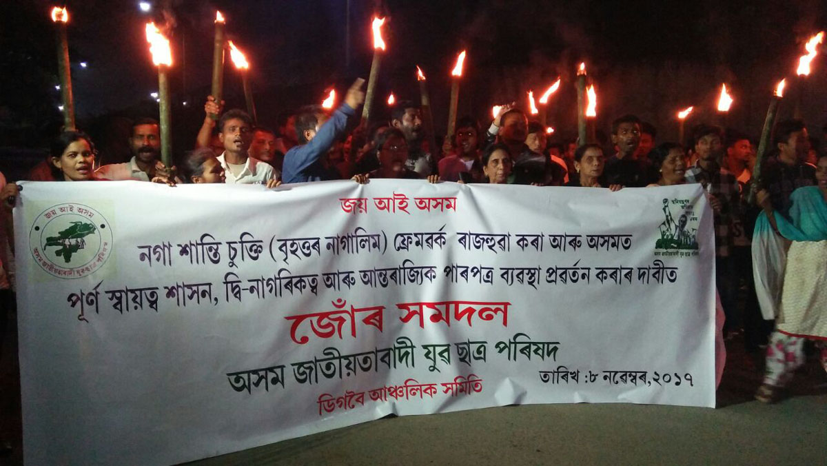 ডিগবৈ, নৱেম্বৰ ৮: নগা শান্তি চুক্তি ফ্ৰেমৱৰ্ক ৰাজহুৱা কৰা, অসমত পূৰ্ণ স্বায়ত্ব শাসন প্ৰৱৰ্তন, দ্বি নাগৰিকত্ব আৰু আন্তঃৰাজ্যিক পাৰ পত্ৰ প্ৰদানৰ দাবীত ডিগবৈত অসম জাতীয়তাবাদী যুৱ ছাত্ৰ পৰিষদৰ আঞ্চলিক সমিতিয়ে জোঁৰ সমদল বাহিৰ কৰে৷ বিয়লি পৰিষদৰ প্ৰায় শতাধিক কৰ্মীয়ে হাতে হাতে জুই শিখা লৈ ৰাজ্য চৰকাৰ মূৰ্দাবাদ, কেন্দ্ৰীয় চৰকাৰ মূৰ্দাবাদ, বিজেপি চৰকাৰ হুচিয়াৰ আদি চৰকাৰ বিৰোধী শ্ল’গানেৰে ৰাজপথত উত্তাল প্ৰতিবাদ সাব্যস্ত কৰে৷ পৰিষদৰ তিনিচুকীয়া জিলা সমিতিৰ সাংগঠনিক সম্পাদক যদু সোনোৱাল আৰু যুটীয়া সম্পাদক কাঞ্চন বৰাই বৃহত্তৰ নাগালিম গঠনৰ কেন্দ্ৰীয় চৰকাৰৰ সিদ্ধান্তক তীব্ৰ বিৰোধীতা কৰি ৰাজ্য আৰু কেন্দ্ৰীয় চৰকাৰে নিৰ্বাচনৰ প্ৰাকক্ষণত অসমৰ জনতাক ভুৱা প্ৰতিশ্ৰুতি দিয়াৰ লগতে অসমীয়াৰ স্বাভিমানত আঘাত সনাৰ অভিযোগ উত্থাপন কৰে৷ পৰিষদে কেন্দ্ৰীয় চৰকাৰক অসম বিৰোধী মনোভাৱ পৰিহাৰ কৰিবলৈ সকীয়াই দিয়ে৷ অন্যথা পৰৱৰ্তী সময়ত সমগ্ৰ ৰাজ্যজুৰি ব্যাপক আন্দোলন গঢ়ি তোলাৰ হুংকাৰ দিয়ে৷