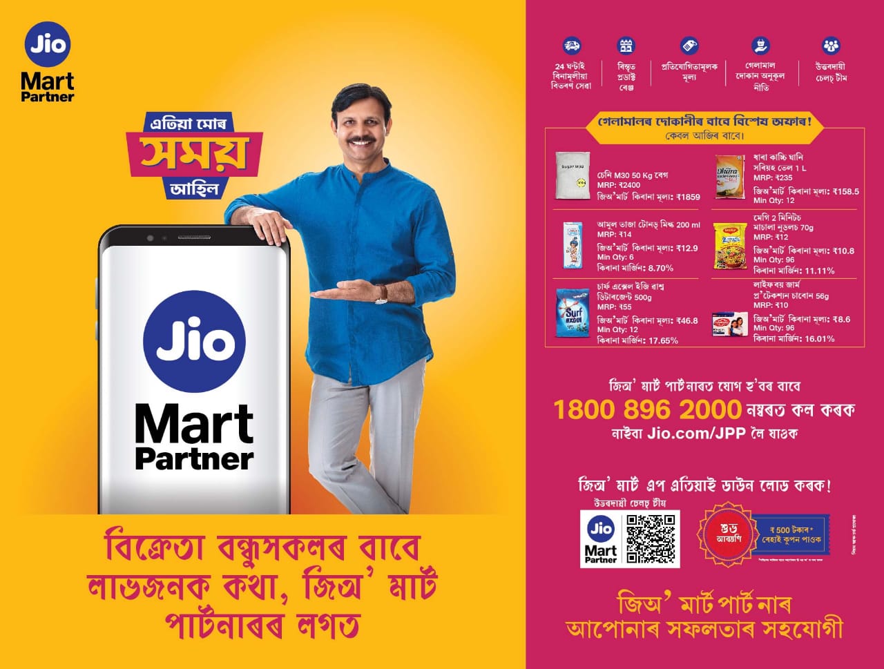 ইয়াৰ নতুন অভিযানৰ জৰিয়তে ৰিলায়েন্সে জিঅ’ পাৰ্টনাৰ এপ্প, জিঅ’ পিঅ’এছ প্লেটফৰ্মৰ লগতে জিঅ’স্মাৰ্ট কিৰানা পাৰ্টনাৰ প্ৰস্তাৱকে ধৰি নতুন বাণিজ্য অফাৰসমূহৰ ব্যাপক সংহতিৰ সৈতে গুৱাহাটীৰ কিৰানা আৰু ব্যৱসায়ীসকলৰ ওচৰলৈ যাব। নতুন বাণিজ্য প্ৰস্তাৱ, জিঅ’মাৰ্ট পাৰ্টনাৰ ব্যৱসায়ীসকলে তেওঁলোকৰ মোবাইল ফোনত জিঅ’মাৰ্ট পাৰ্টনাৰ এপ্প ডাউনলোড কৰি লৈ অৰ্ডাৰ দিয়া আৰম্ভ কৰি জিঅ’মাৰ্টৰ অংশীদাৰ হ’ব পাৰে বাই বেটাৰ আৰু গেট ফ্ৰী নেক্সট ডে ডেলিভাৰীৰ মূল প্ৰস্তাৱৰ সৈতে।
