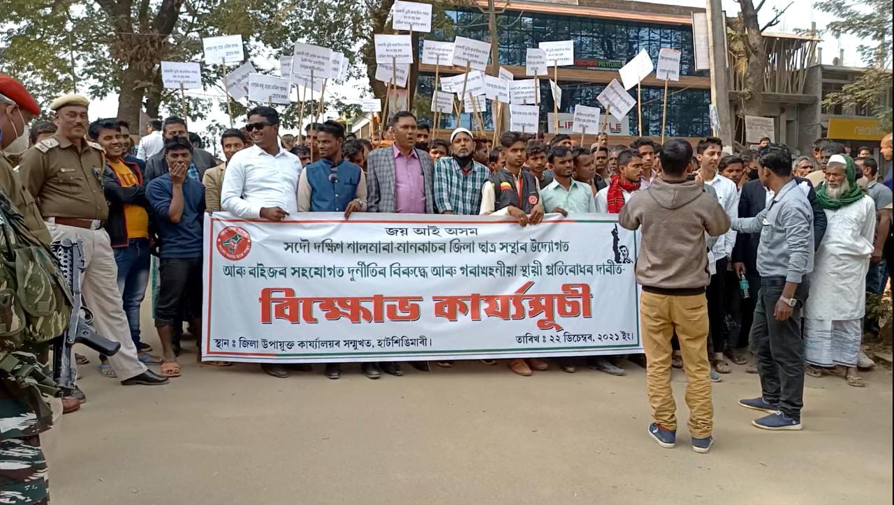 সদৌ দক্ষিণ শালমাৰা-মানকাচৰ জিলা ছাত্ৰ সন্থাৰ নেতৃ্ত্বত হাটশিঙিমাৰী জিলা উপায়ুক্তৰ কাৰ্যালয়ৰ সম্মুখত এক বিক্ষোভ কাৰ্যাসূচী ৰূপায়ন কৰা হয়। প্ৰায় শতাধিক আছুৰ কৰ্মী তথা স্থানীয় ৰাইজৰ সহযোগত অনুষ্ঠিত হোৱা এই বিক্ষোভ কাৰ্যসূচীত প্ৰতিবাদকাৰী সকলে হাতে হাতে প্লেকাৰ্ড লৈ বিভিন্ন শ্ল’গানেৰে জিলা উপায়ুক্তৰ কাৰ্যালয় চৌহদ উত্তাল কৰি তোলে।