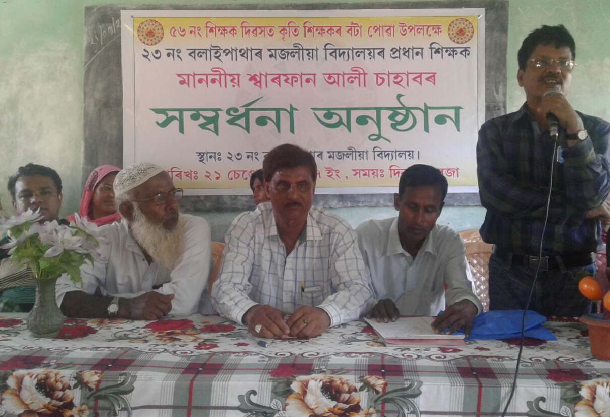 কলগাছিয়া, ২২ ছেপ্টেম্বৰঃ বৰপেটাৰ ৰূপসী প্ৰাথমিক শিক্ষাখণ্ডৰ অন্তৰ্গত ২৩নং বলাইপাথাৰ মজলীয়া বিদ্যালয়তৰ প্ৰধান শিক্ষক শ্বাৰফান আলীক বিদ্যালয় পৰিচালনা সমিতি, ছাত্ৰ-ছাত্ৰী, শিক্ষক আৰু স্থানীয় ৰাইজৰ তৰফৰ পৰা সম্বৰ্ধনা জ্ঞাপন কৰা হয়। উল্লেখ্য যে, বৰপেটাৰ কলগাছিয়া ৰূপসী শিক্ষাখণ্ডৰ অন্তৰ্গত বলাইপাথাৰ মজলীয়া বিদ্যালয়তৰ প্ৰধান শিক্ষক এম শ্বাৰফান আলীক ৫৬ সংখ্যক শিক্ষক দিৱস উপলক্ষে বৰপেটা জিলা পৰিমণ্ডলৰ বিদ্যালয় সমূহৰ পৰিদৰ্শক, জিলা প্ৰাথমিক শিক্ষাখণ্ডৰ উদ্যোগত আৰু বৰপেটা জিলা প্ৰশাসনৰ সহযোগত ৫ ছেপ্তেম্বৰত বৰপেটা জিলা ভিত্তিক আয়োজন কৰা ৫৬ সংখ্যক শিক্ষক দিৱসত শৈক্ষিক, নৈতিক আৰু কৰ্তব্য পৰায়ণ আদৰ্শৰ প্ৰতি লক্ষ্য ৰাখি জিলা শিক্ষা আৰু প্ৰশিক্ষণ প্ৰতিষ্ঠানৰ তৰফৰ পৰা অসম চৰকাৰে আদৰ্শ শিক্ষক বঁটাৰে সন্মানিত কৰিছিল। ইয়াৰ উপলক্ষে ২৩ নং বলাইপাথাৰ মজলীয়া বিদ্যালয়তো শিক্ষক গৰাকীক ৰাজহুৱা জনোৱা হয়৷ বিদ্যালয় পৰিচালনা সমিতিৰ সভাপতি খন্দকাৰ ইউছুফ আলীৰ সভাপতিত্বত অনুষ্ঠিত সম্বৰ্ধনা সভাত মুখ্য অতিথি হিচাপে ৰূপসী প্ৰাথমিক শিক্ষাখণ্ডৰ শিক্ষা বিষয়া পৰেশ চন্দ্ৰ কলিতা আৰু অতিথি হিচাপে এমাইচ সমন্বয়ক আলম খান, চিআৰচিচি হেফজুৰ ৰহমানৰ লগতে কেবাগৰাকী বিশিষ্ট ব্যক্তি উপস্থিত থাকে।
