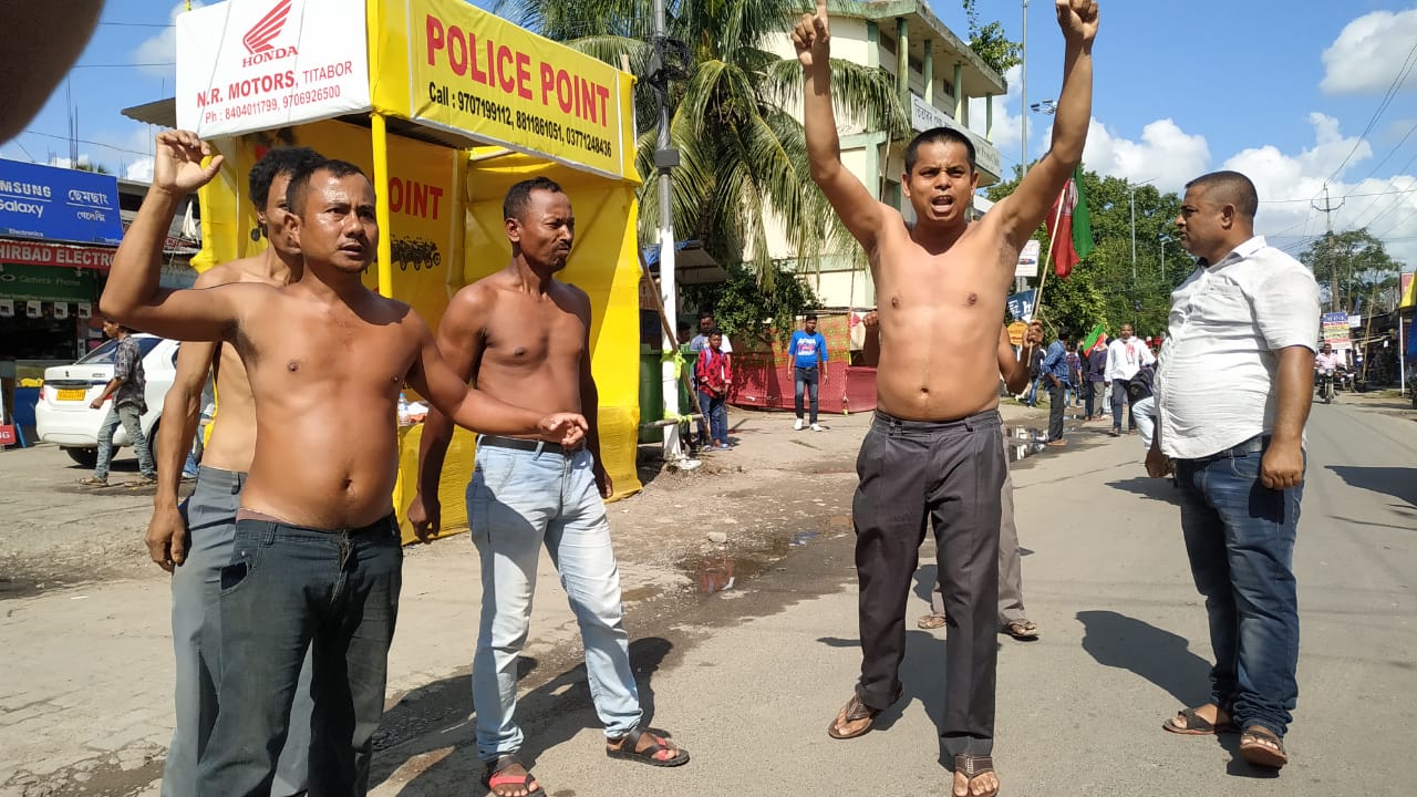 অখিল গগৈৰ মুক্তিৰ দাবীত অৰ্ধনগ্ন হয় কেইবাজনো প্ৰতিবাদকাৰী। তিতাবৰ ষ্টেচন তিনি আলিত প্ৰতিবাদ সাব্যস্ত কৰে সংগঠনটোয়ে। চৰকাৰ বিৰোধী শ্লোগানেৰে কঁপাই তোলে প্ৰতিবাদস্থলী।
