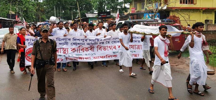 সোণাপুৰ, ১২ জুনঃ জনস্বাস্থ্য কাৰিকৰী বিভাগৰ গুৱাহাটী সংমণ্ডলৰ অধীনস্থ ডিমৰীয়াৰ বিভিন্ন প্ৰান্তত বিকল হৈ থকা বিশুদ্ধ খোৱাপানী আঁচনি সমূহ শীঘ্ৰে কাৰ্যক্ষম কৰাৰ দাবীত আন্তঃডিমৰীয়া আঞ্চলিক ছাত্ৰ সন্থাই প্ৰতিবাদী কাৰ্যসূচী ৰূপায়ন কৰে৷ প্ৰায় পাঁচ শতাধিক প্ৰতিবাদকাৰীয়ে পুৱা ১১ বজাত সোণাপুৰ ক্ষুদ্ৰ ক্ৰীড়াঙ্গনৰ একত্ৰিত হৈ জনস্বাস্থ্য কাৰিকৰী বিভাগৰ প্ৰতীকি শৱদেহ লগতে হাতে হাতে বেনাৰ, প্লে-কাৰ্ড, খালী বাল্টি, কলহ আদি লৈ চৰকাৰ তথা প্ৰশাসন বিৰোধী শ্ল’গানেৰে চৌদিশ উত্তাল কৰি তোলে৷ প্ৰতিবাদকাৰী সকলে নতুন বজাৰ পথেৰে গৈ সোণাপুৰ ৰাজহ চক্ৰ বিষয়াৰ কাৰ্যালয়ৰ চক্ৰ বিষয়া ধ্ৰুৱজোতি হাজৰিকাৰ জৰিয়তে কামৰূপ জিলা উপায়ুক্ত আৰু জনস্বাস্থ্য কাৰিকৰী বিভাগৰ আয়ুক্ত সচিৱলৈ স্মাৰক পত্ৰ প্ৰেৰণ কৰে৷ সন্থাই জনস্বাস্থ্য কাৰিকৰী বিভাগক ডিমৰীয়াত বিকল হৈ থকা বিশুদ্ধ খোৱাপানী আঁচনি সমূহ শীঘ্ৰে কাৰ্যক্ষম কৰি সৰ্বসাধাৰণ ৰাইজক বিশুদ্ধ খোৱাপানী যোগানৰ দাবী জনায়৷ আন্তঃডিমৰীয়া আঞ্চলিক ছাত্ৰ সন্থাই জানিবলৈ দিয়া মতে, সমগ্ৰ ডিমৰীয়াত জনস্বাস্থ্য কাৰিকৰী বিভাগৰ অধীনত প্ৰায় দুশৰো অধিক বিশুদ্ধ খোৱাপানী আঁচনি আছে যদিও ইয়াৰে প্ৰায় দহ খন মানহে কাৰ্যক্ষম হৈ আছে৷ অনিয়মীয়া বিদুৎ যোগান, ডিজেলৰ অভাৱ, বিকল হৈ থকা জনস্বাস্থ্য কাৰিকৰী বিভাগৰ পানী যোগানৰ যন্ত্ৰ-পাতি সমূহ পুনঃমেৰামতি নকৰাৰ ফলত কেবাকোটি টকা ব্যয় সাপেক্ষে নিৰ্মাণ কৰা আঁচনি সমূহ বৰ্তমান সৰ্ম্পূণ ৰূপে বন্ধ হৈ পৰিছে৷ যাৰ ফলত বৰ্তমান অঞ্চলটোৰ সৰ্বসাধাৰণে নদী, নিজৰা, কেঁচা কুৱাৰ পানী খাবলগীয়া হৈছে৷