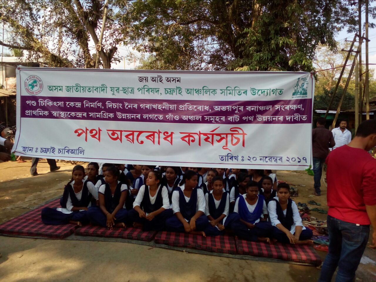 চৰাইদেউ, ২০ নৱেম্বৰ: চৰাইদেউ জিলাৰ চফ্ৰাই চাৰিআলিত অসম জাতীয়তাবাদী যুৱ-ছাত্ৰ পৰিষদৰ চফ্ৰাই আঞ্চলিক সমিতিয়ে ২ ঘণ্টীয়া পথ অৱৰোধ কাৰ্যসূচী ৰূপায়ন কৰে। পশু চিকিৎসাকেন্দ্ৰ নিৰ্মাণ, দিচাং নৈৰ গৰাখহনীয়া প্ৰতিৰোধ, অভয়পুৰ বনাঞ্চল সংৰক্ষণ, প্ৰাথমিক স্বাস্থ্যকেন্দ্ৰৰ সামগ্ৰিক উন্নয়নৰ লগতে গাঁও অঞ্চল সমূহৰ বাট-পথ উন্নয়ণৰ দাবীত ২ ঘণ্টীয়া পথ অৱৰোধ কাৰ্যসূচী ৰূপায়ন কৰে। প্ৰতিবাদকাৰীয়ে বিভিন্ন শ্ল’গান দি প্ৰতিবাদস্থলী উত্তাল কৰি তোলে। প্ৰতিবাদস্থলীত স্কুলীয়া ছাত্ৰ-ছাত্ৰী সকলক লৈ প্ৰতিবাদ কৰাৰ সময়ত স্থানীয় সচেতন মহলকে ধৰি কেইজনমান অভিভাৱকে সমালোচনাও কৰে। যিহেতু ৪ ডিচেম্বৰৰ পৰা বছৰিকীয়া পৰীক্ষা আৰম্ভ, মাথোঁ কিছুদিন বাকী আছে পৰীক্ষাৰ্থীৰ বাবে তেনে সময়ত ছাত্ৰ-ছাত্ৰীক লৈ প্ৰতিবাদ কৰাটো কিমানখিনি গ্ৰহণযোগ্য বুলি কয় সচেতন মহলে। আৰু প্ৰতিবাদকাৰীয়ে অতি কম সময়ৰ ভিতৰত যদি চৰকাৰে এই সমস্যাসমূহৰ সমাধান নকৰে তেন্তে চফ্ৰাই ভিতৰুৱা গাঁও অঞ্চলৰ হাজাৰ হাজাৰ মানুহে ৰাজপথত গণতান্ত্ৰিক প্ৰক্ৰিয়াৰে প্ৰতিবাদ সাব্যস্ত কৰিব বুলি চৰকাৰক সকীয়াই দিয়ে।