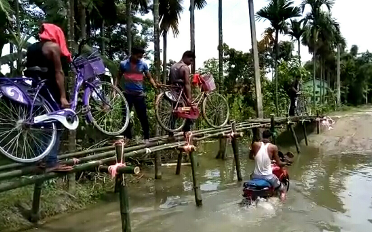 সোণতলী, ৭ জুলাইঃ দক্ষিণ কামৰূপৰ সোণতলীত বিধ্বস্ত যাতায়ত ব্যৱস্থা। জনপ্ৰতিনিধি নাইবা বিভাগীয় কৰ্তৃপক্ষৰ চূড়ান্ত গাফিলতিত ৰাইজে গাঁঠিৰ ধন খৰচ কৰি যাতায়ত সুবিধাৰ্থে নিৰ্মান কৰিলে বাঁহৰ সাঁকো। নগৰবেৰাৰ পৰা সোণতলী হৈ গুৱাহাটী লৈ যোৱা একমাত্ৰ পথটো নিৰ্মানৰ ছয়মাহ পিছতেই ভাঙি যায়৷ পথটোৰ গাতত পৰি বহু ছাত্ৰ-ছাত্ৰী, ৰোগী তথা সৰ্বসাধাৰণ দুৰ্ঘটনাগ্ৰস্থ হৈছে৷ সামান্য বৰষুণতে পথটোত কৃত্ৰিম বানপানীৰ সৃষ্টি হয়। স্থানীয় ৰাইজে ঠিকাদাৰৰ লগতে গড়কাপ্তানি বিভাগক পথটো মেৰামতি কৰাৰ বাবে বাৰম্বাৰ অনুৰোধ কৰে  যদিও বিভাগীয় কৰ্তৃপক্ষৰ দ্বায়িত্বহীনতাত উপায়ন্তৰ ৰাইজে নিৰ্মান কৰিলে এখন বাঁহৰ সাঁকো৷ সোণতলীৰ পৰা নগৰবেৰালৈ যোৱাৰ একমাত্ৰ পথটোৰ ভখুৰাদিয়াত বানৰ সোতে সাঁকোখন খহাই নিয়ে৷ ফলত গাওঁ খনৰ ৰাইজে পুনৰ গাঁঠিৰ ধন খৰচ কৰি বাঁহৰ সাঁকো নিৰ্মান কৰে৷ বিভাগটোৰ লগতে ঠিকাদাৰক এই পকী পথটো মেৰামতি কাৰণে স্হানীয় ৰাইজে বহুবাৰ অৱগত কৰে যদিও কোনো সু-ফল লাভ কৰা নাই। প্ৰধানমন্ত্ৰী গ্ৰাম চড়ক যোজনাৰ অধীনত নিৰ্মাণ কৰা বৃহত্তৰ সোণতলী প্ৰায়বোৰ পথ ভাঙি বিধ্বস্ত হৈ পৰিছে। চৰকাৰ তথা বিভাগীয় কৰ্তৃপক্ষৰ এনে গাফিলতিৰ সময়ত সোণতলীবাসীৰ এই প্ৰচেষ্টা সকলোৰে কাৰণে আদৰ্শ হওঁক।