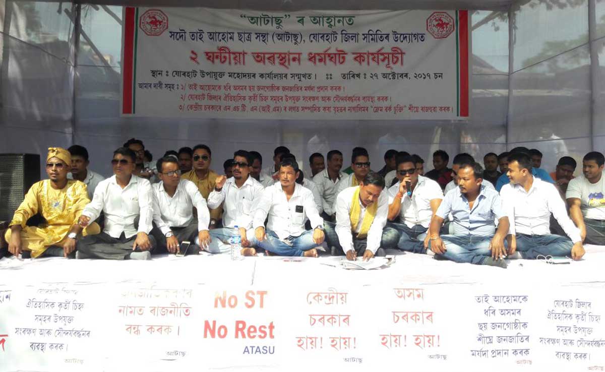 যোৰহাট, ২৭ অক্টোবৰঃ সদৌ অসম টাই আহোম ছাত্ৰ সন্থাই তাই আহোম জনগোষ্ঠীকে ধৰি অসমৰ জলন্ত সমস্যাসমূহ শীঘ্ৰে সমাধানৰ দাবীত যোৰহাট জিলাৰ উপায়ুক্তৰ কাৰ্যালয়ৰ সন্মুখত দুঘন্টীয়া অৱস্থান ধৰ্মঘট কাৰ্যসূচী ৰূপায়ণ কৰে। সন্থাই টাই আহোমৰ লগতে অসমৰ ছয় জনগোষ্ঠীৰ জনগোষ্ঠীক শীঘ্ৰে জনজাতিকৰণৰ মৰ্যাদা প্ৰদান কৰা, ঐতিহাসিক কীৰ্তিচিহ্ন সমূহৰ উপযুক্ত সংৰক্ষণ আৰু সৌন্দৰ্যবৰ্দ্ধনৰ জৰুৰী ব্যৱস্থা গ্ৰহণ কৰা, কেন্দ্ৰীয় চৰকাৰে এনএছচিএন (আইএম)ৰ লগত সম্পাদিত কৰা বৃহত্তৰ নাগালিমৰ ফ্ৰেমৱৰ্ক চুক্তি শীঘ্ৰে ৰাজহুৱাকৰণৰ দাবীত চৌদিশ উত্তাল কৰি তোলে। টাই আহোম ছাত্ৰ সন্থাই প্ৰতিবাদস্থলীৰ পৰা জিলা উপায়ুক্তৰ যোগে মুখ্যমন্ত্ৰী আৰু প্ৰধানমন্ত্ৰীলৈ স্মাৰক পত্ৰও প্ৰেৰণ কৰে। সন্থাই দাবীসমূহ শীঘ্ৰে মানি নল’লে পৰৱৰ্তী পৰ্যায়ত জংগী আন্দোলন গঢ়ি তোলাৰ হুংকাৰ দিয়ে।